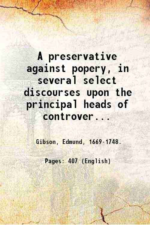 A preservative against popery, in several select discourses upon the principal heads of controversy between Protestants and Papists: being written and published by the most eminent divines of the Church of England, chiefly in the reign of King James II. Collected by the right Rev. Edmund Gibson . carefully revised and ed. for the British society for promoting the religious principles of the Reformation, by the Rev. John Cumming . Volume 1 1848