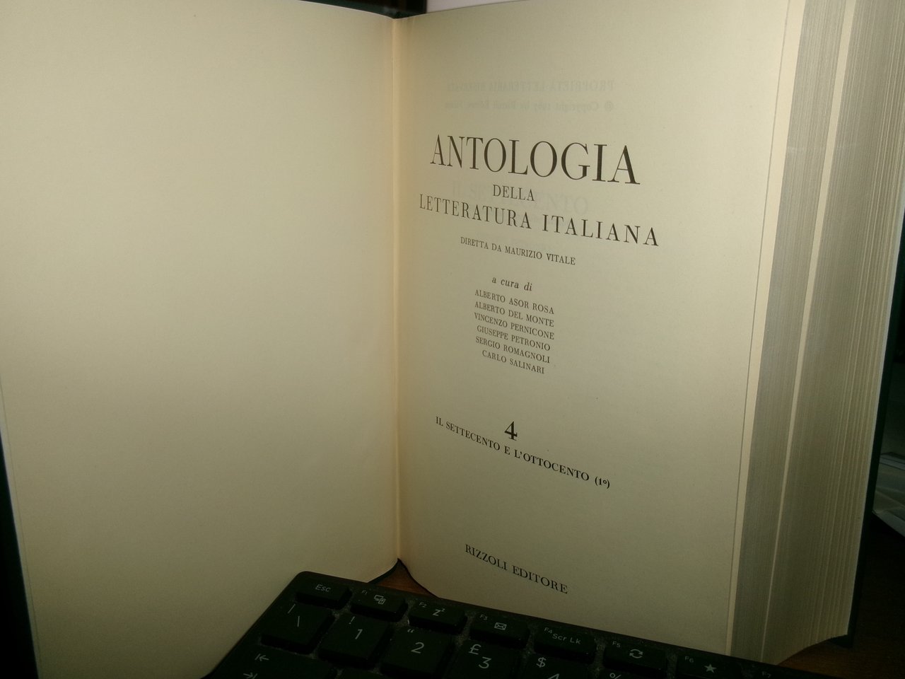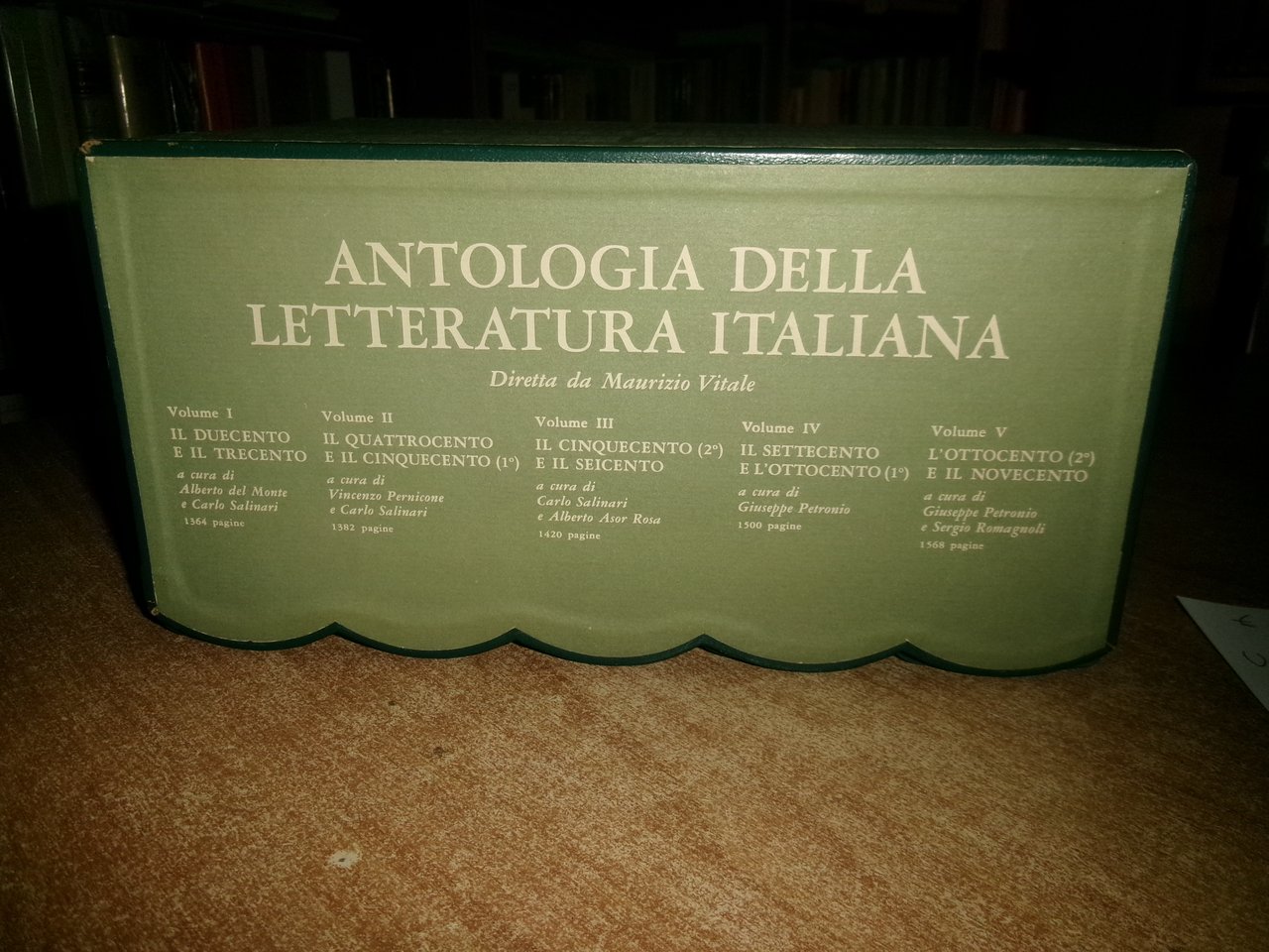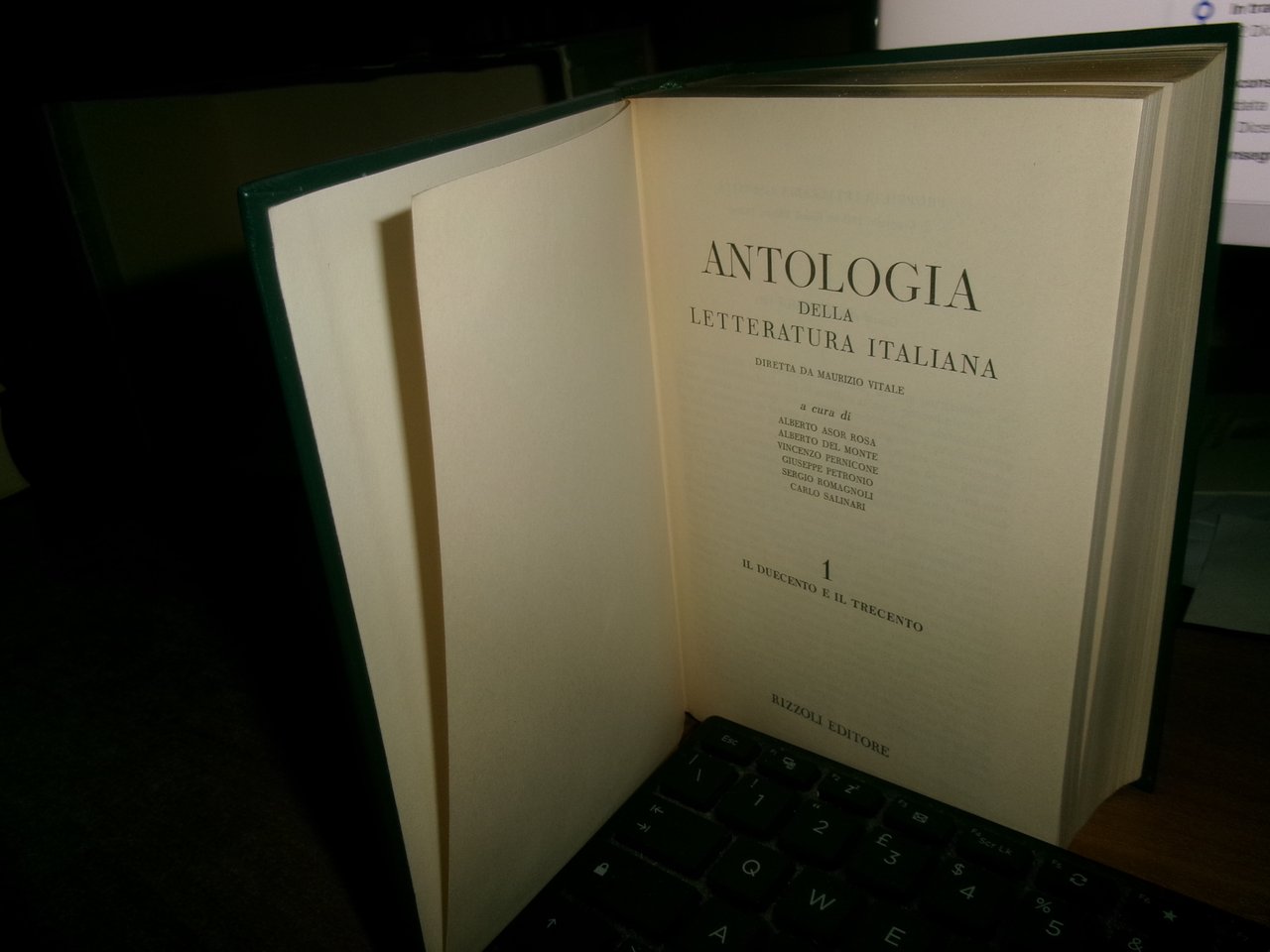 AA. VV. Antologia della Letteratura Italiana diretta da Maurizio Vitale. Milano, Rizzoli Editore, 1970/71. Quarta edizione. 5 volumi in-8°, similpelle con fregi e titoli in oro sui dorsi, taglio superiore dorato e segnalibri in cotone. Volume 1: I duecento e il trecento XVI, 1347 PP.; Volume 2: Il quattrocento e il cinquecento 1380 pp.; Volume 3: Il cinquecento e il seicento1417 pp.; Volume 4: settecento e ottocento 1497 pp:, Volume 5: ottocento novecento 1567 pp. Come nuovi in astuccio edit. Uff. C - III - 1