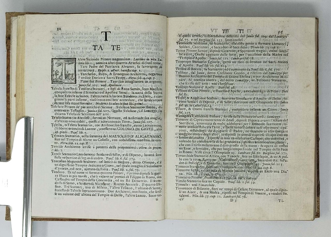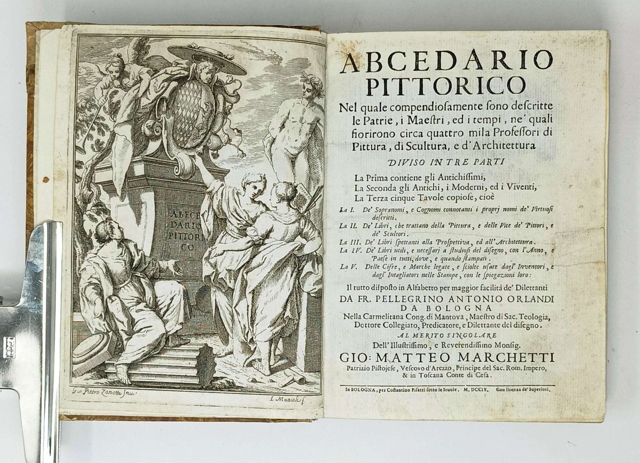>n-4, pp. 436. Legatura coeva m. perg. e ang., tassello in pelle con tit. oro al dorso. Bell'antiporta con figure allegoriche ed armi di Gio. Matteo Marchetti, patrizio pistoiese e vescovo di Arezzo, dis. G.P. Zanotti ed inc. in rame da L. Mattioli. Nel testo 5 tavole silogr. di monogrammi; iniz. e fregi silogr. Prima edizione di quest'importante ''opera tratta da tutte le opere Biografiche con molta cura, e divenne la più comoda fonte di simili notizie'' (Cicognara). Il dizionario nelle prime due parti offre una quantità di preziose notizie sugli artisti antichissimi, antichi, moderni e viventi, elencati in ordine alfabetico per nome anziché per cognome; la terza, invece, contiene cinque tabelle con i soprannomi degli artisti, repertori bibliografici, monogrammi degli incisori, ecc. L'opera ebbe subito grande successo al punto che venne ristampata, ampliata e migliorata, ben otto volte durante il XVIII secolo. Bell'esempl. Cicognara 2169. Schlosser-Magnino p. 485 e 508.