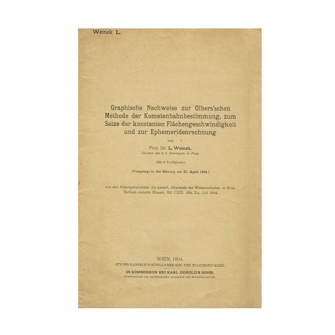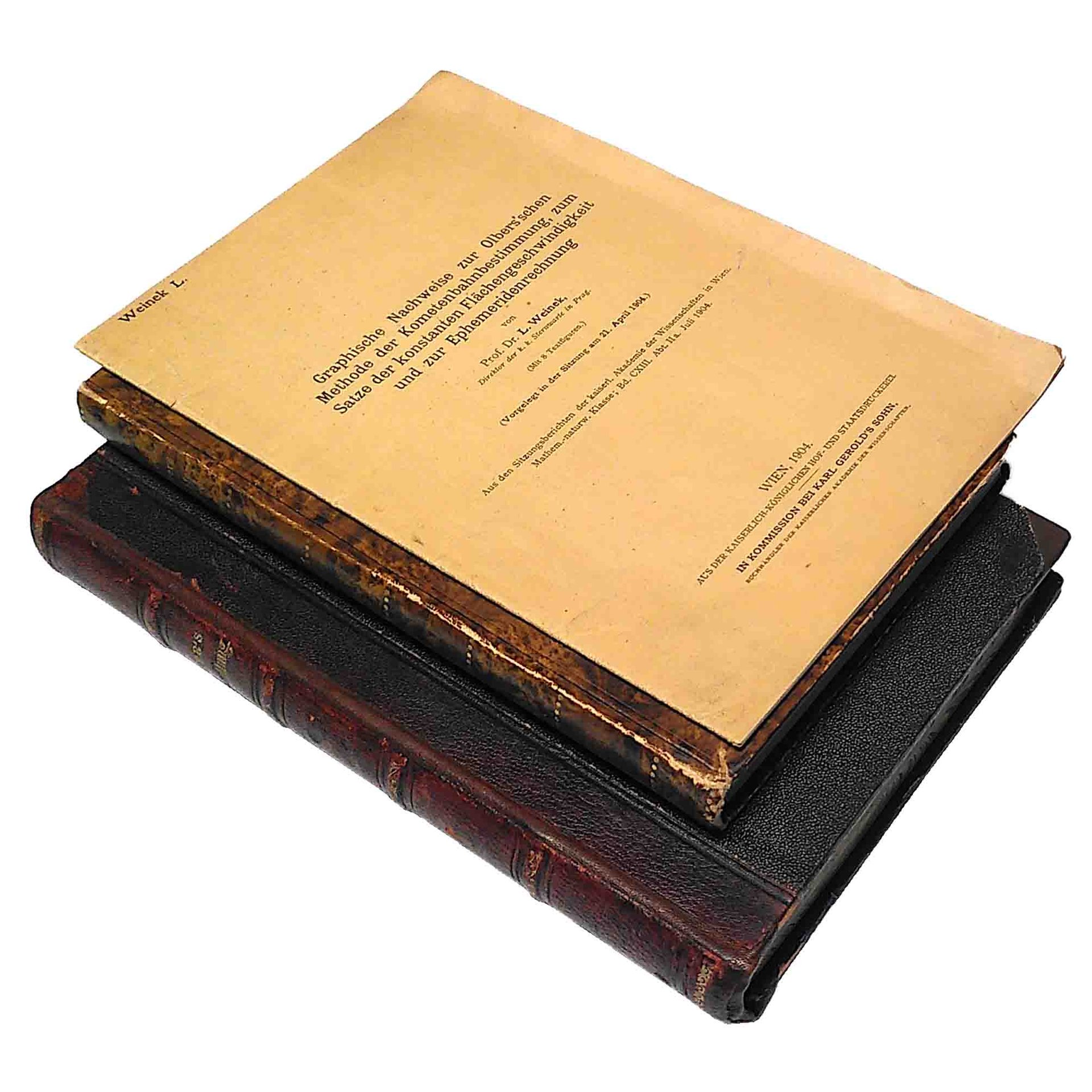 First edition of Olbers' groundbreaking work on computing the orbit of comets, together with the substantially corrected and enlarged 3rd edition from 1864 as well as a rare offprint of a paper by Ladislaus Weinek from 1904 depicting graphical evidence of Olbers' method. – Contents, Author: With this treatise, the Bremen based physician and astronomer Heinrich Wilhelm Olbers (1758-1840) established his reputation as one of the leading scholars on astronomy of his time. Olbers had discovered a comet in 1796 and developed a new method for calculating his path. This method replaced the tedious and often inaccurate calculations of Euler and La Place. „In a letter to F.X. von Zach, director of the newly founded observatory on the Seeberg, near Gotha, Olbers asked weather his treatise on this method should be printed, and if so, how this could be done. After reading the treatise and using it with excellent results to compute the orbit of the comet of 1779, which had presented great difficulties to many astronomers, von Zach decided to see it through the press himself. It appeared at Weimar 1797.“ (DSB). – Enclosed: (1) 3rd ed., enlarged by J. G. Galle. With Olbers' portrait as frontispiece and 1 folded plate. Leipzig: Voigt & Günther 1864. 8vo. XXXVI, 334 p. Contemporary half leather. (2) L.[adislaus] Weinek: Graphische Nachweise zur Olbersch'schen Methode der Kometenbahnbestimmung (…) Mit 8 Textfiguren. Aus den Sitzungsberichten der kaiserl. Akademie der Wissenschaften in Wien. Mathem.-naturw. Klasse; Bd. CXIII. Abt. IIa. Juli 1904. Vienna: Verlag der Kaiserlichen Akademie der Wissenschaften (in commission at Alfred Hölder [K.-k. Hof- und Staatsdruckerei]) 1904. 8vo. 20 p. Original publisher's wrappers. – Condition: Cover at edges and corners slightly worn, title page with some ink staines and one restored fault at lower right corner, some pages slightly foxy and water-stained, generally a solid copy. Cover of present copy of the 3rd edition (enclosure 1) with some small wear, paper in parts foxy, with owner's stamp on pre-title. Wrappers of the academy paper (enclosure 2) slightly stained, minimally torn at margins, otherwise well preserved. – Rarity: Very hard to find in this set, particularly with the late but important supplement by Weinek, during this period director of the Prague observatory. – Reference: DSB X, 198; Houzeau-L. 11965; Poggendorff II, 320.