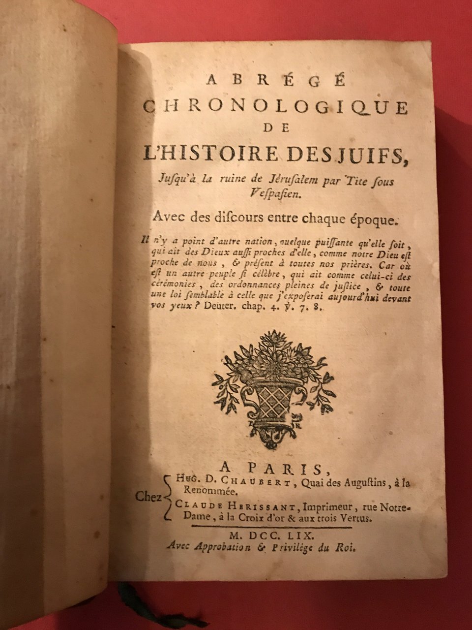 Abrégé chronologique de l'histoire des Juifs, jusq'à la ruine de Jérusalem par Tite sous Vespasien. Avec des discours entre chaque époque