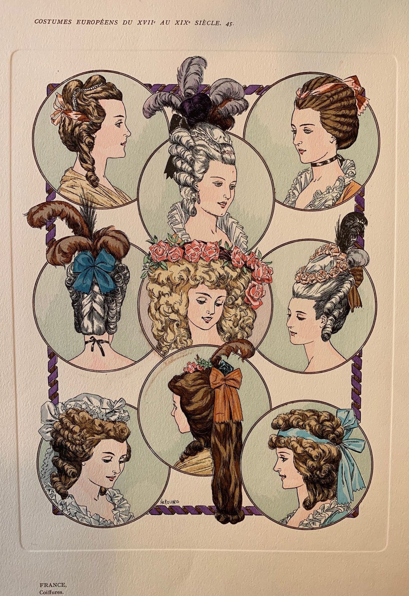 >Riproduzione dell'incisione originale di Herouard, raffigurante acconciature femminili e vari stili tratta da "Costumes Européens du XVII au XIX siècle. Misure 27 x 20 cm e grandi margini.