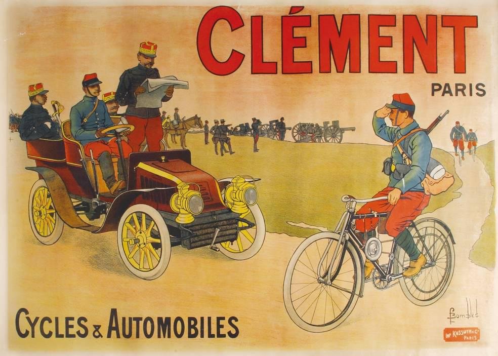 >Litografia originale intelata (cm. 98x130). Raro manifesto pubblicitario della celebre fabbrica francese "Clement", con in primo piano un automobile ed una bicicletta guidate da membri dell'esercito francese. Ben conservato.