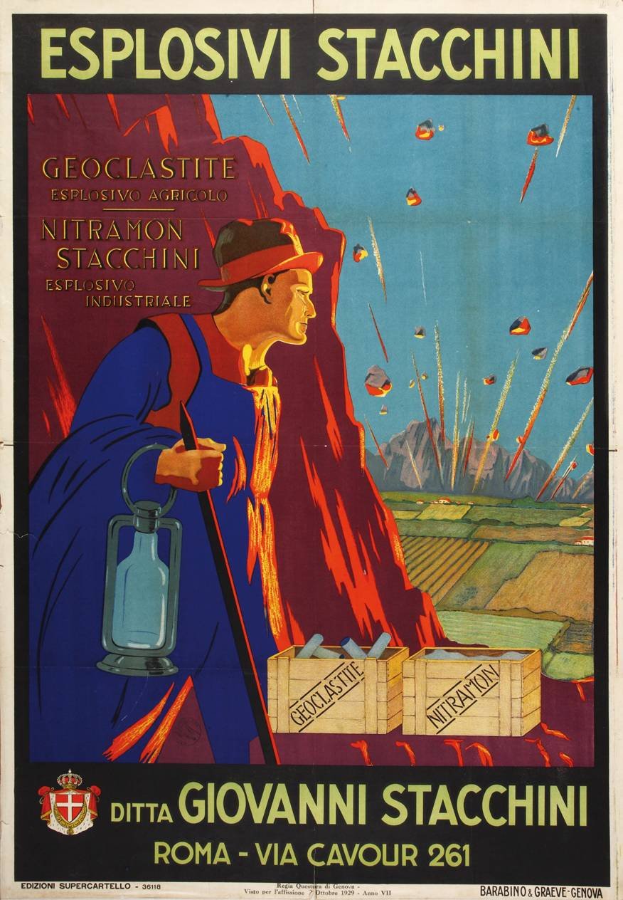 >Manifesto litografico, intelato, cm. 102x70. Pubblicità di esplosivi agricoli e industriali di una società di nome "Giovanni Stacchini": un minatore assiste nascosto dietro ad una roccia a delle esplosioni. Esemplare ben conservato.