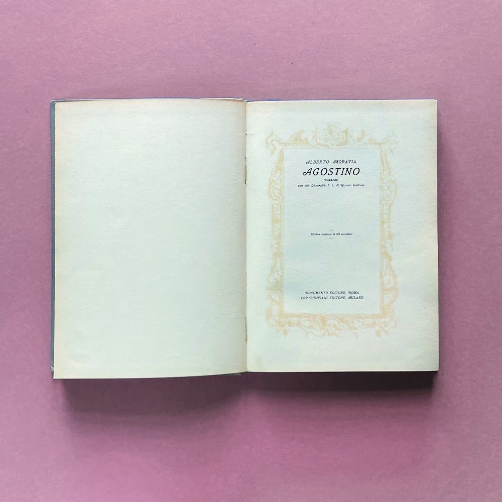 4°, pp. (8), 100, legatura in capa e cartone con acquaforte su zinco di Luigi Bartolini. Collana La Margherita a cura di Federico Valli, n. 4. Tirato in 500 copie, esemplare numero 496. La tiratura limitata fu usata dall'editore per aggirare il divieto imposto dal regime a Moravia, di pubblicare sotto pseudonimo. Mancano le due litografie originali di Guttuso previste in allegato all'interno. Volume ben conservato.