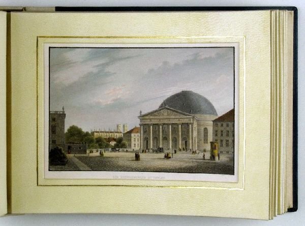 20 Ansichten von Berlin. 17 Stahlstiche (davon 16 im Originalkolorit), 2 Aquatintatafeln und 1 Holzstichtafel, alle unter Pergament-Passepartouts mit Goldfileten. Moderner Halbpergamentband mit blauen Lederdeckeln und Filetenvergoldung. Quer-Folio (335:240 mm). Das ansprechende, privat zusammengestellte Album zeigt nach einem "Plan der Königlichen Residenz-Stadt Berlin" u. a. die Ecke Wilhelmstraße/Unter den Linden, das Brandenburger Tor, das königliche Schloß, die Schloßbrücke, die Siegessäule, die Nikolaikirche, die Michaeliskirche, die Hedwigskirche, die Domkirche, den Gendarmenmarkt, den Alexanderplatz, die Krolloper, Schloss Tegel, Schloss Charlottenburg, das Jägerhaus auf dem Werder etc. - Die Passepartouts minimal aufgeworfen; der Pergamentstreifen der Blockheftung unten gesprungen.