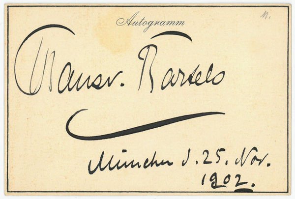 1 S. Qu.-8vo. Hans von Bartels, Sohn eines kaiserlich russischen Kollegienassessors, erhielt seinen Unterricht bei dem Marinemaler Rudolf Hardorff in Hamburg, bildete sich in Düsseldorf weiter fort und unternahm Studienreisen durch Norddeutschland und Italien. "1885 siedelte er nach München über, bereiste alljährlich die Küsten Hollands, Englands und Frankreichs, wo er seine bevorzugten Sujets, einsame Strände und bewegte See, fand" (DBE); 1891 wurde er zum königlich bayerischen Professor ernannt. - Die Verso-Seite mit kleinen Montagespuren, recto mit gedr. Kopfzeile "Autogramm".