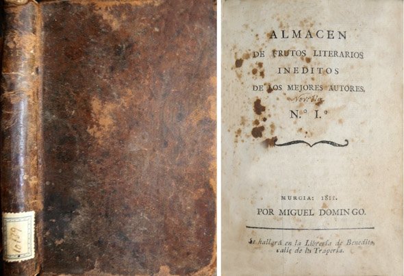 Murcia, por Miguel Domingo, se hallará en la Librería de Benedito, calle de la Trapería, 1811. 8vo.; 276 pp. Encuadernación en piel marbreada de la época, ligeramente fatigada.