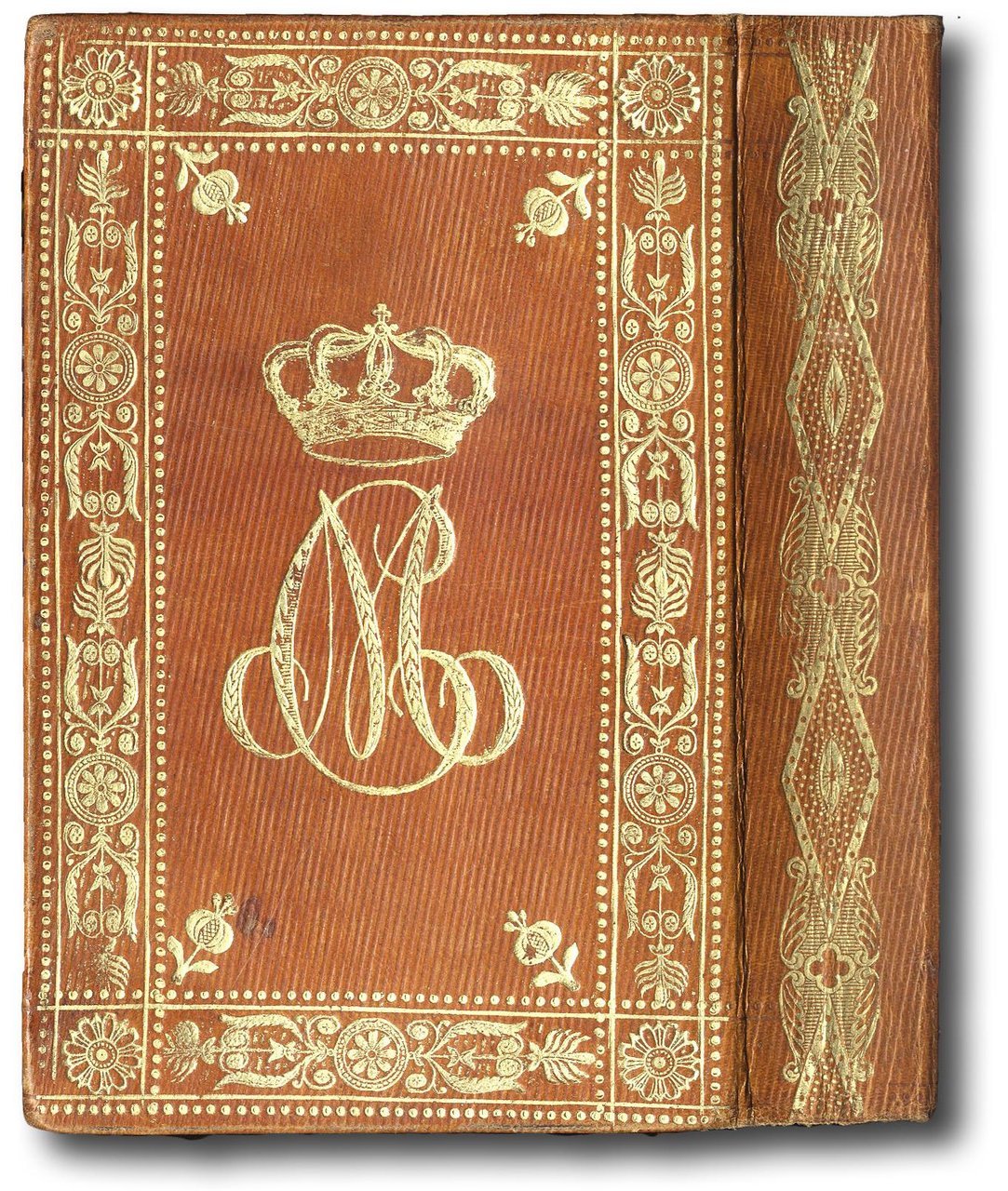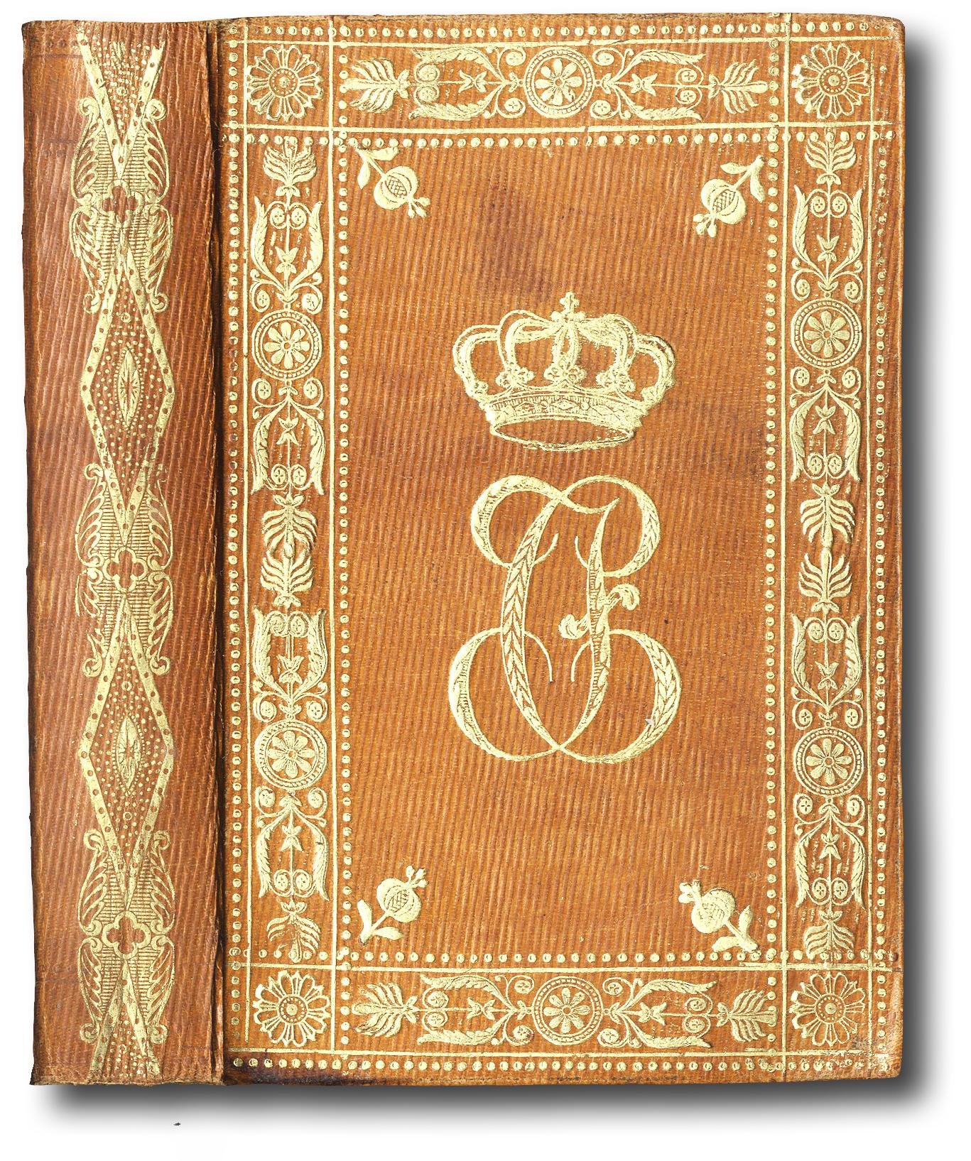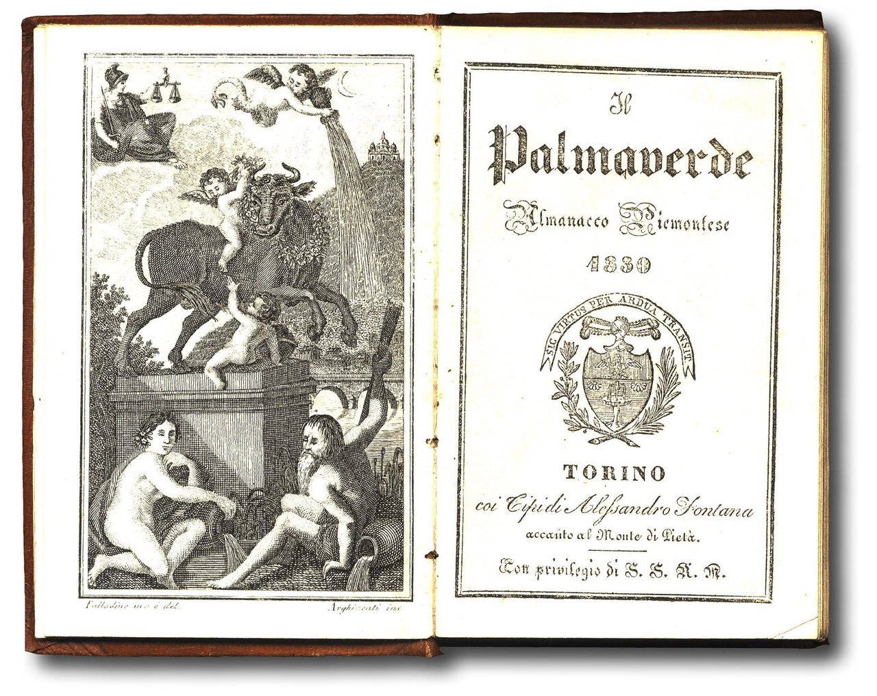 >in-24 (130x81mm), pp. 364, (2), con vignette zodiacali, testatine e finalini, vignetta al frontespizio e antiporta figurata. Bella legatura coeva in zigrino nocciola, i piatti adorni di elaborata bordura neoclassica, al centro grandi monogrammi coronati di Carlo Felice e Maria Cristina di Savoia, tagli dorati. Bell'esemplare con ex-libris di Mercurino Arborio Gattinara, Biblioteca del Castello di Rivara.