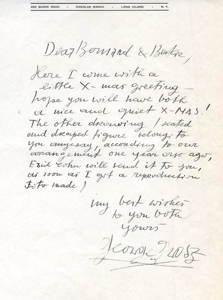 4to. 1 p. To “Bernard & Beckie” (i. e. Bernard and Rebecca Reis): “Here I come with a little X-mas greeting - hope you will have both a nice and quiet X-MAS! The other drawing / seated and draped figure belongs to you anyway, according to our arrangement one year orso [!] ago, as soon as I get a reproduction foto made [.]”. - Bernard Reis worked for the Marlborough Gallery for many years. - On stationery with printed letterhead.
