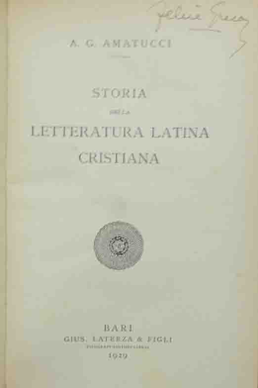 Aurelio Giuseppe Amatucci, Storia della letteratura latina cristiana, Gius. Laterza e Figli, Bari 1929, pp. 361, cm 20, legatura in mezza tela nera con titoli in oro al dorso. Segnatura di collocazione all’occhiello, firma d’appartenenza al frontespizio. Lievi tracce d’uso alla legatura, minime fioriture, qualche sporadica sottolineatura a lapis, per il resto molto ben conservato.