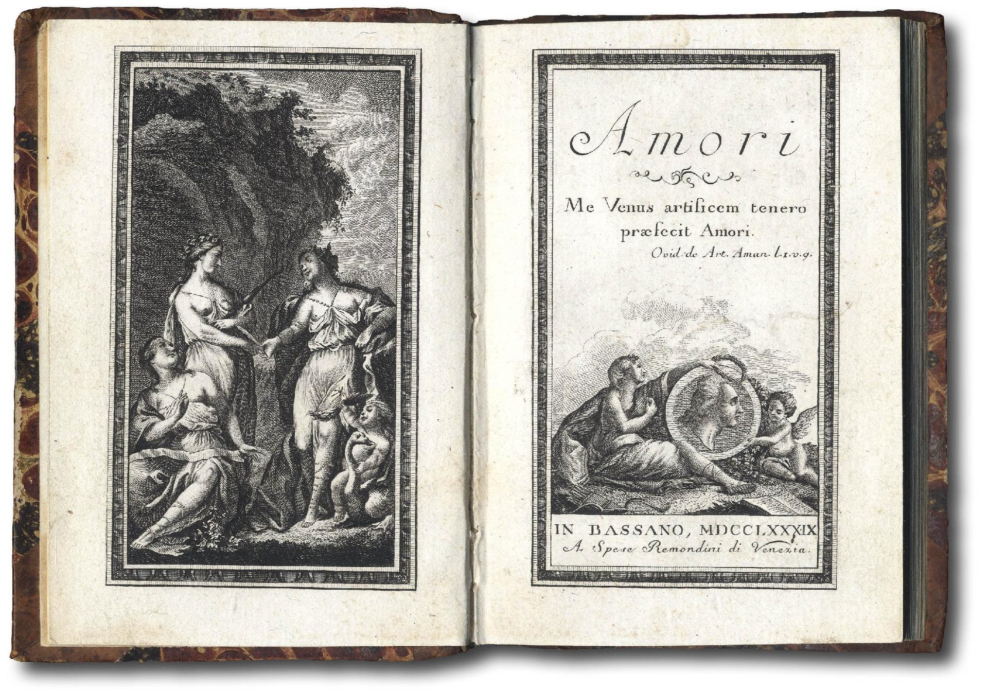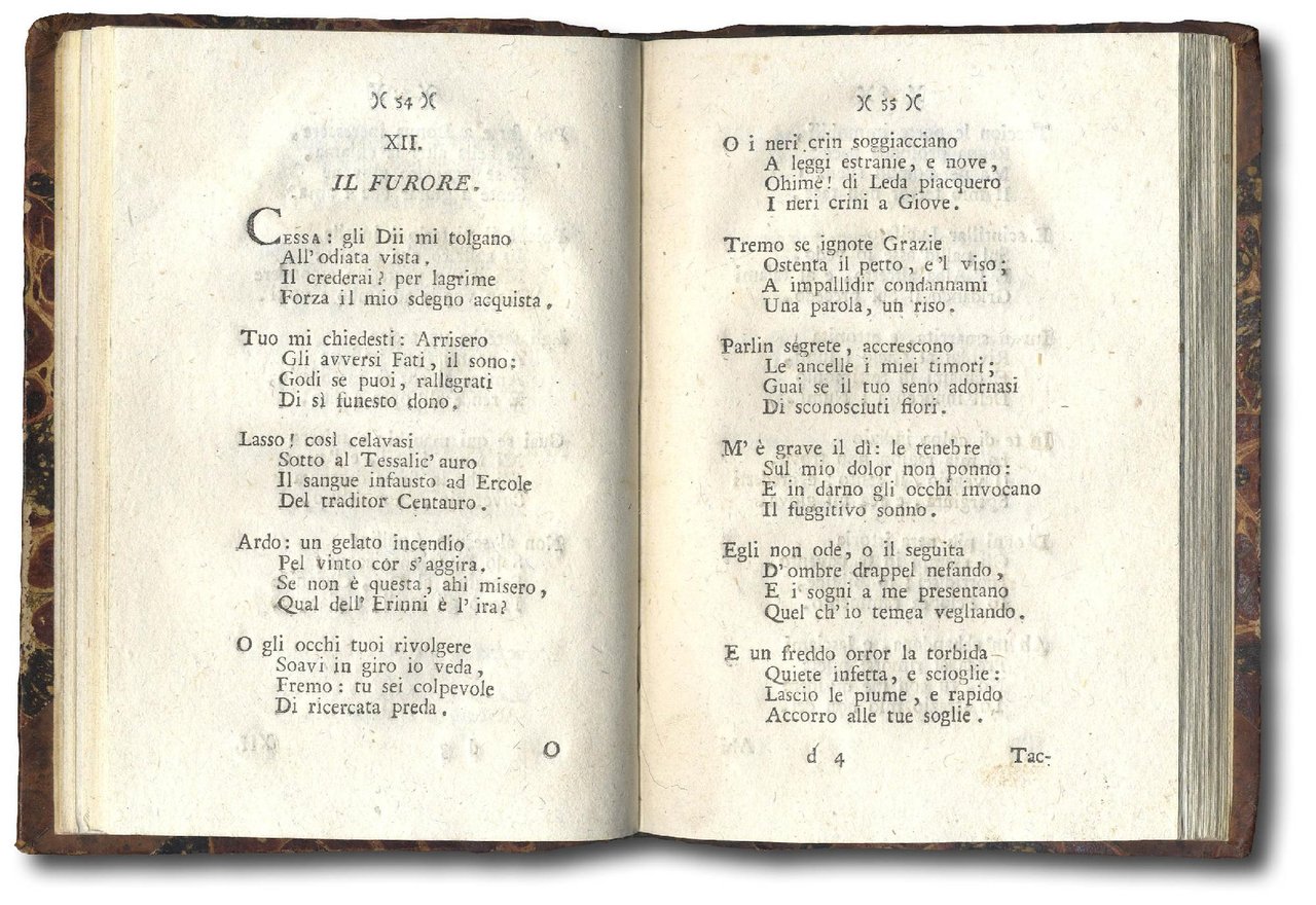 >in-8 piccolo, (153x105 mm), 2 fogli preliminari (antiporta e titolo figurati inc. in rame), pp. 141 di versi poetici. Legatura del tempo in m. pelle, carta marmorizz. sui piatti. Seconda edizione di ''amatissime canzonette che furono e saranno sempre ls delizia dei cuor più teneri e più gentili'' (dedica al lettore). Dedica del Savioli a Vittoria Corsini Odescalco duchessa di Bracciano. Edizione rara e pregiata di questi piacevoli versi di Savioli (1729-18048), non conosciuta alla bibliografia di Gamba che descrive l'edizione G.B. Bodoni del 1795. Gamba 270.