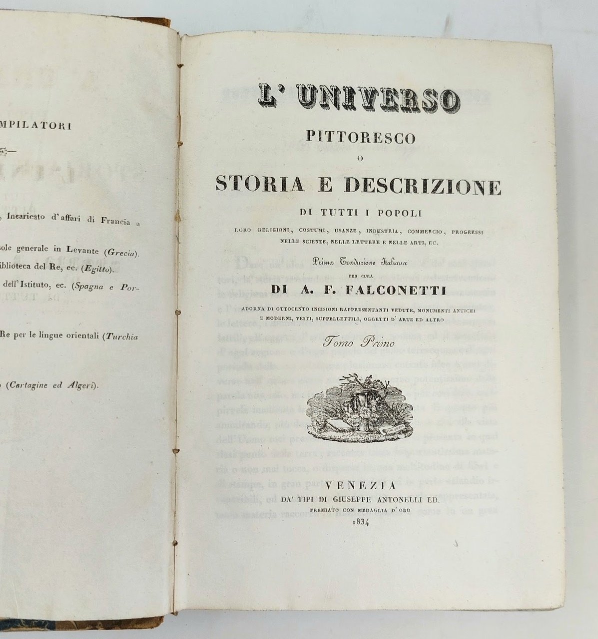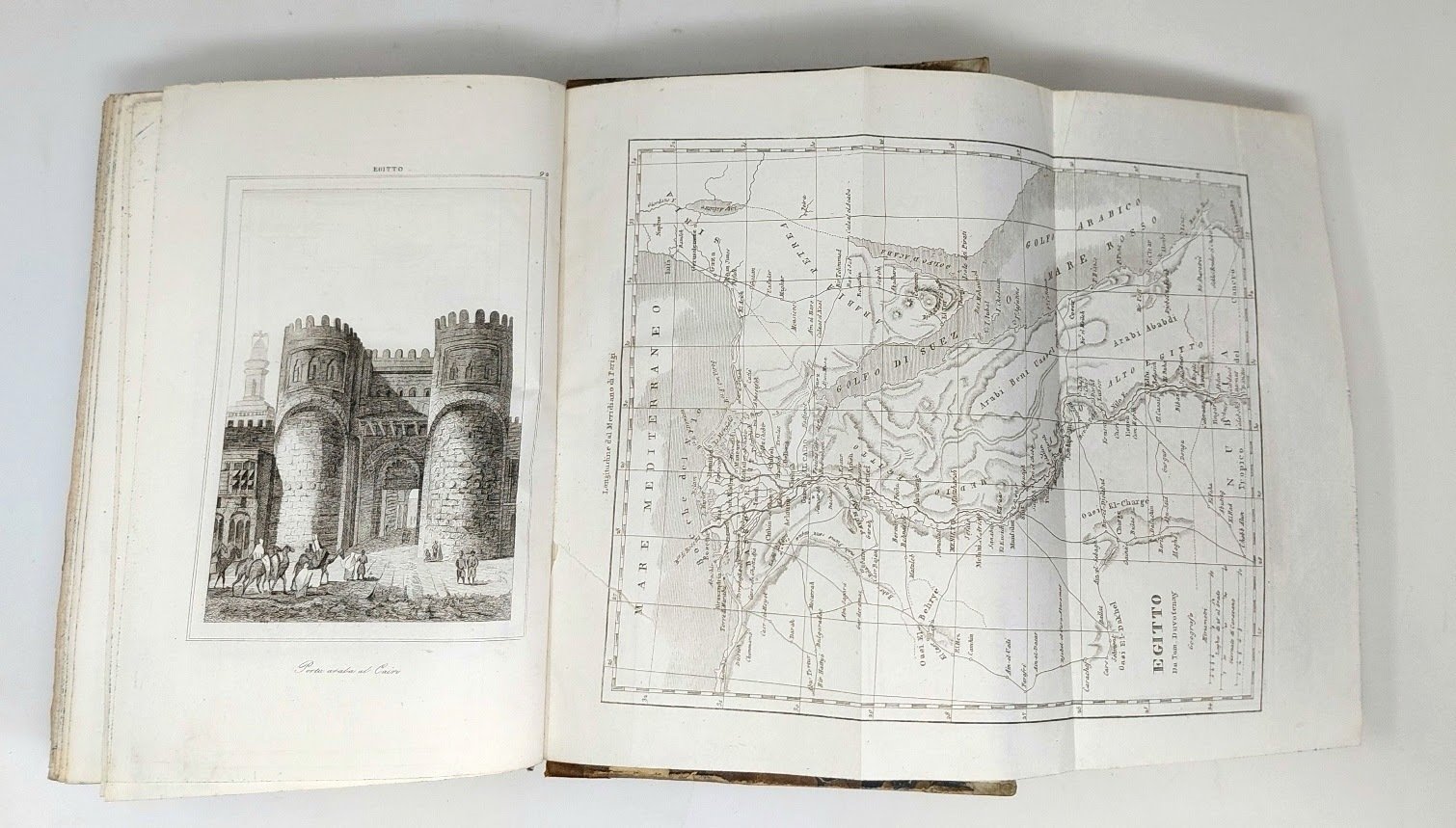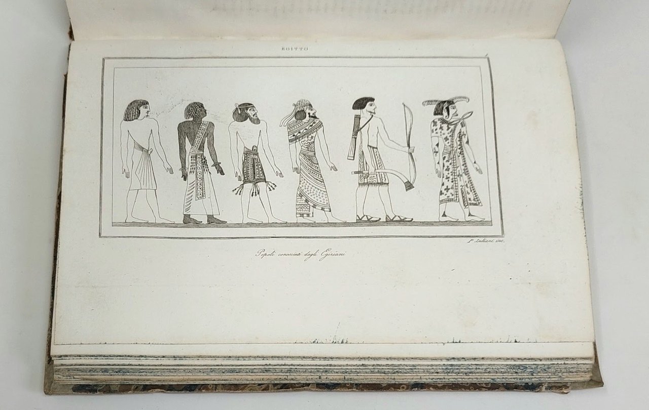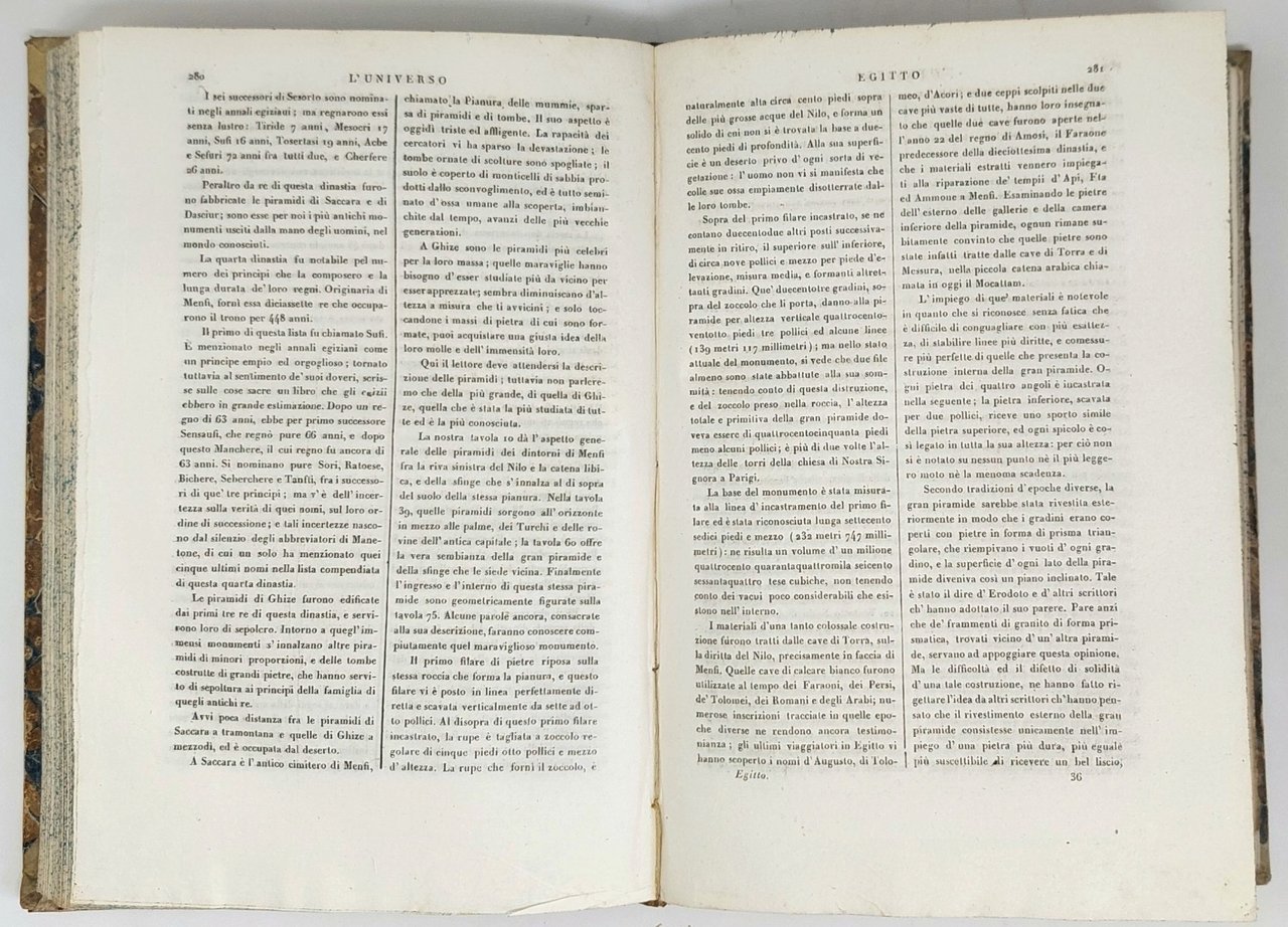>in-8, pp. 503 (testo su due colonne), 93 tavole fuori testo in fine, di cui 1 carta geografica dell'Egitto ripiegata. Bella legatura coeva in mezza pelle, titolo e fregi oro al dorso, tagli spruzzati. Edizione italiana dell'opera di Champollion tradotta da Francesco Falconetti, facente parte della collana L'universo o storia e descrizione di tutti i popoli. Ottimo esemplare.