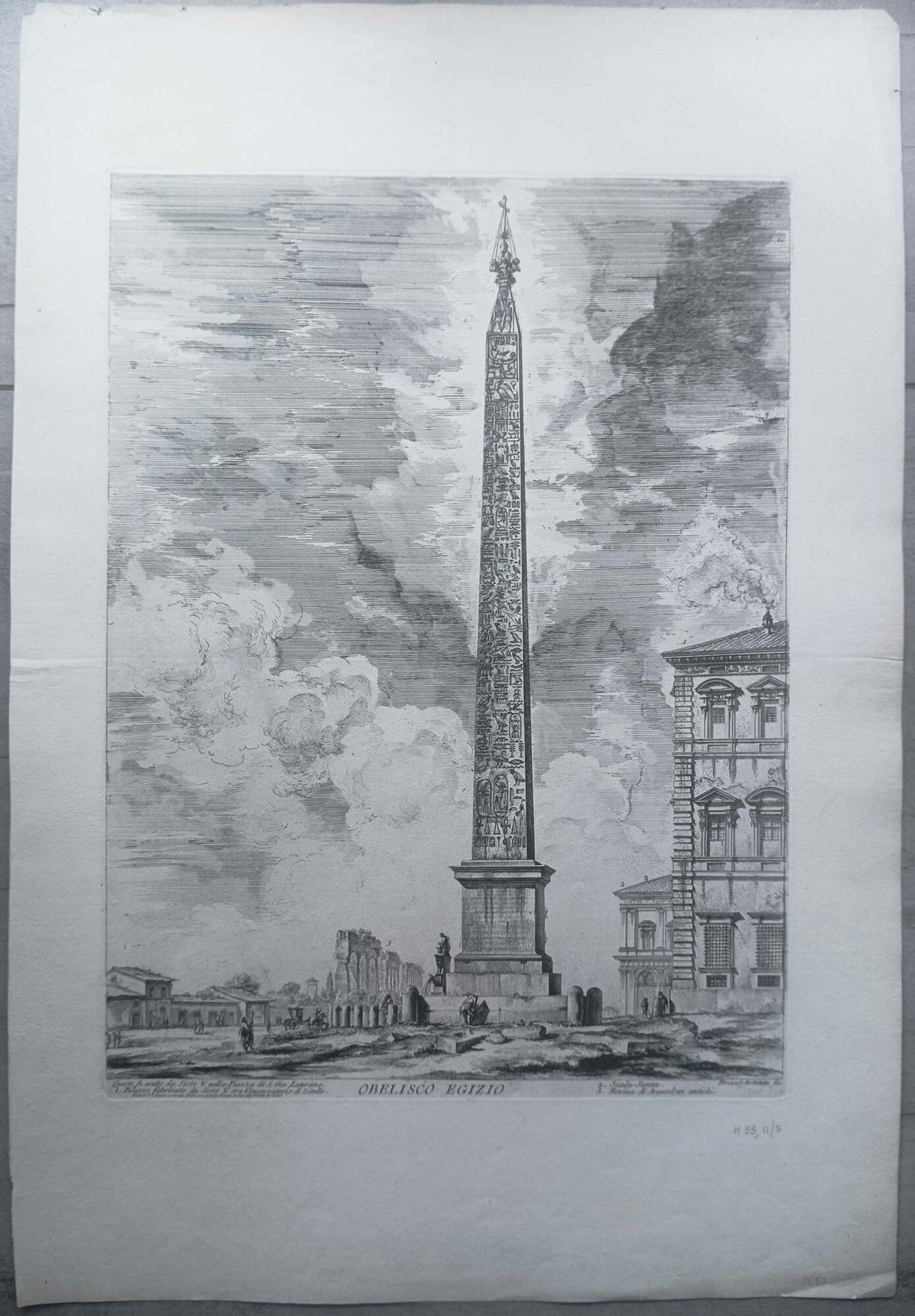 >Acquaforte originale (mm 542x406 e margini). Titolo lungo il margine inferiore al centro, in basso a sinistra "Questo fu eretto da Sisto V. nella Piazza si S. Gio. Laterano." cui segue legenda che prosegue a destra del titolo, con tre rimandi; firma in basso a destra entro lastra "Piranesi Architetto fec.". Secondo stato su cinque. Tratta dalla celebre serie di 135 “Vedute di Roma disegnate ed incise da Giambattista Piranesi Architetto Veneziano” (eseguite dal 1748 al 1778), capolavoro dell'incisione di tutti i tempi. Questa celebre serie di acqueforti, iniziata intorno all'anno 1747, rappresenta l'opera più nota e richiesta della produzione artistica dell'autore. Mediante questo ambizioso progetto iconografico, ampliato nel corso degli anni, l'artista offrì al pubblico un'immagine sistematica e teatralmente suggestiva della Roma barocca con la sua urbanistica trionfale e seppe evocare con straordinaria forza espressiva il mistero e la grandiosità delle rovine dell'antica Roma. Bell'esemplare impresso su carta pesante, vergellata, a grandi margini, filigrana "doppio cerchio e giglio", traccia di antica piega centrale orizzontale. Piccoli starppetti lungo i margini anticamente restaurati.