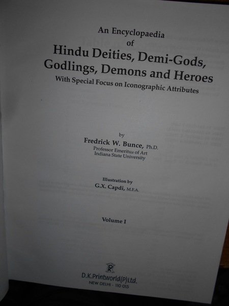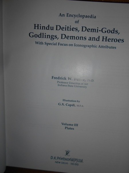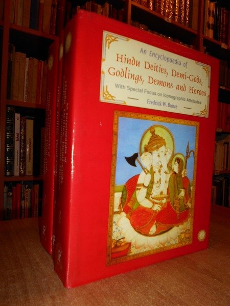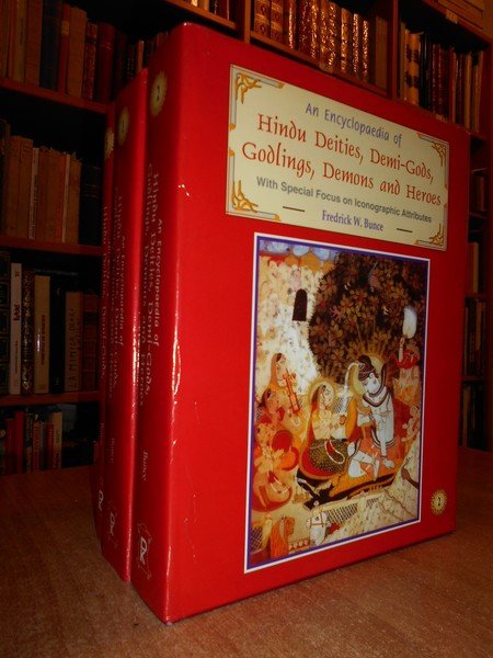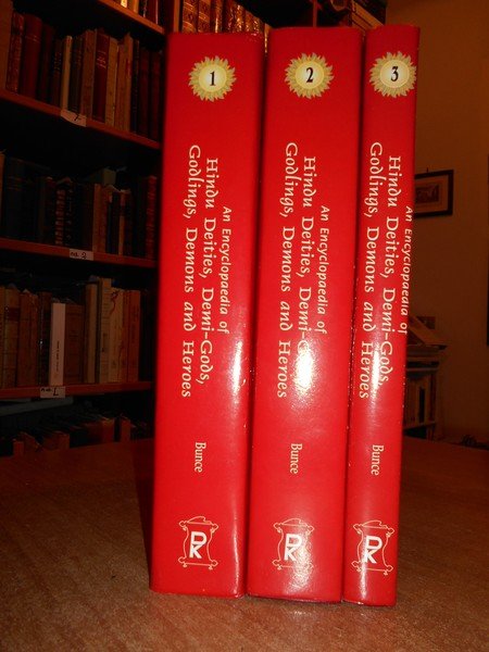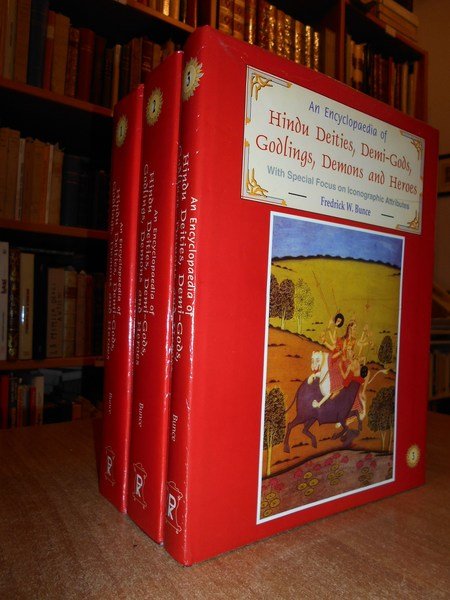 Fredrick, W. Bunce. New Delhi, D.K. Printworld, 2000. An Encyclopaedia of Hindu Deities, Demi-Gods, Godlings, Demons and Heroes With Special Focus on Iconographic Attributes. 3 volumi in-8° grande, pelle e oro con le sovracopertine. xxviii, xiv, xiv, per complessive 1627 pp. con numerose illustrazionini n.t. il terzo volume è dedicato alle tavole. Ottimo esemplare. Neg. mob. rosso