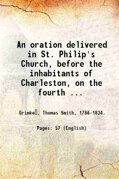 An oration delivered in St. Philip's Church, before the inhabitants of Charleston, on the fourth of July, 1809, by the appointment of the South-Carolina State Society of Cincinnati, and published at the request of that society, and of the American Revolution Society. / By Thomas S. Grimke?. 1809