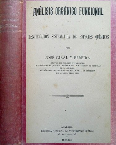 Madrid, Victoriano Suarez, 1913. 4to.; 636 pp., con 8 ilustraciones entre el texto. Cubiertas originales. Rarra edición de uno de los primeros trabajos publicados por el gran bioquímico español, Rector de la Universidad Central en 1936, que moriría en el exilio en México, donde desarrolló una importantísima labor científica. Giral fue Ministro de Asuntos Exteriores de la República Española presidida por Don Juan Negrín.