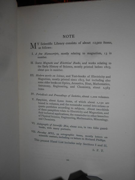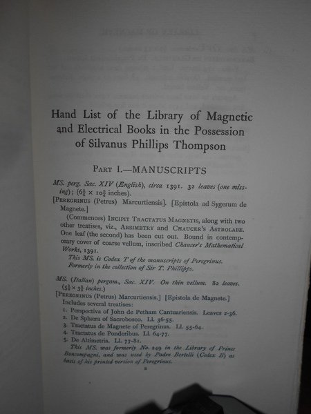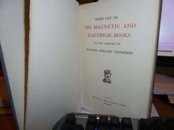 SILVANUS PHILLIPS THOMPSON. London, Printed at The Chiswick Press, 1914. And List of The Magnetic and Eletrical Books in The Library of SILVANUS PHILLIPS THOMPSON. In-8°, cartone coevo con titolo al dorso. vii, 119 pp. Rara edizione originale in ottimo stato di conservazione con barbe. Neg. mob. rosso
