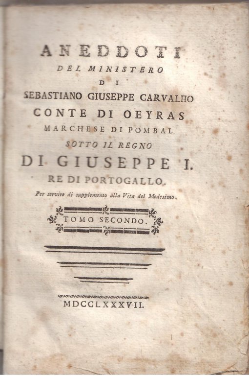 ANEDDOTI DEL MINISTERO DI SEBASTIANO GIUSEPPE CARVALHO CONTE DI OEYRAS MARCHESE DI POMBAL SOTTO IL REGNO DI GIUSEPPE I RE DI PORTOGALLO