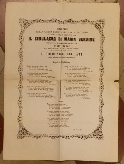 Angelica salutazione inaugurandosi nella Chiesa Parrocchiale di San Antonino il giorno 13 giugno dell'anno 1858 il Simulacro di Maria Vergine senza colpa originale concetta. Questi carmi alla maggior gloria di lei un devoto offeriva ed all'indefesso zelo del M.R. Signore D. Domenico Leurati, Parroco degnissimo della suddetta chiesa dedicava.
