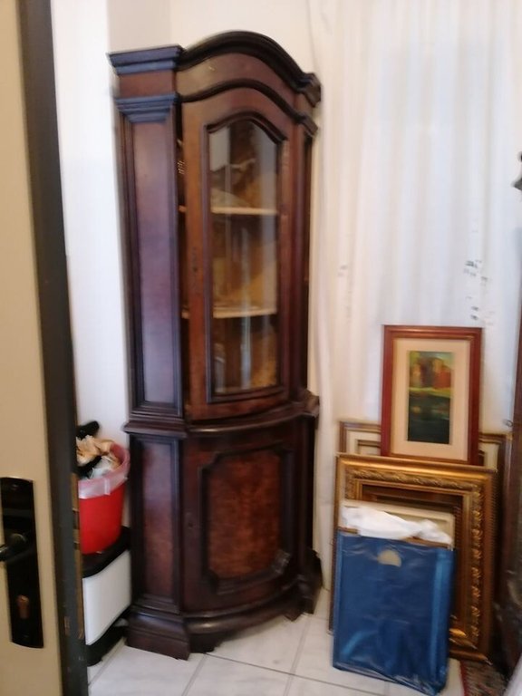 Angoliera Vetro Bombato Impiallacciata in Radica di Noce 5 Ripiani In Damascato