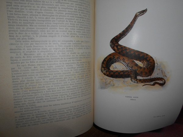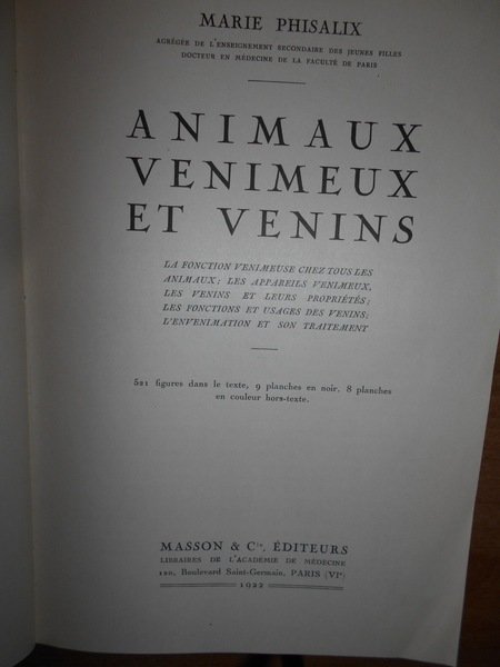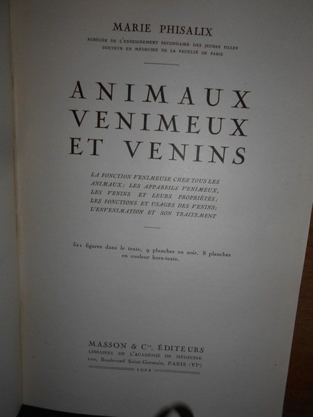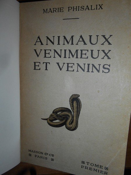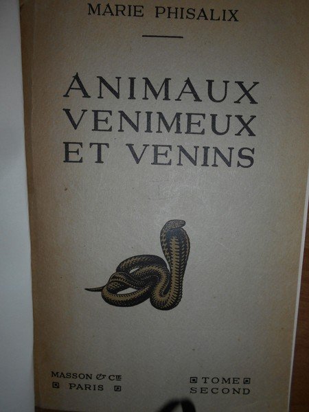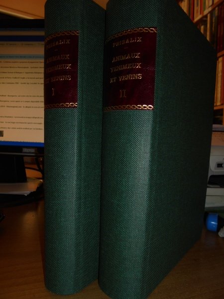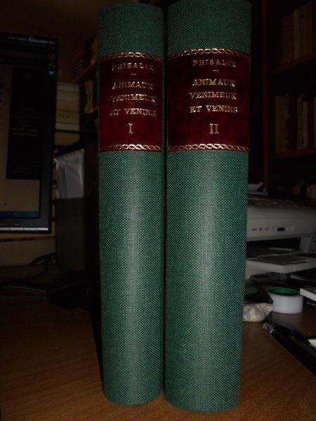 Marie, Phisalix. Paris, Masson & Cie éditeurs, 1922. Animaux Venimeux et Venins. La fonction venimeuse chez tous les animaux; les appareils venimeux, les venins et leurs propriétés; les fonctions et usages des venins; l' envenimation et son traitement. 2 volumi in-8°, tela verde con titoli in oro entro tasselli ai dorsi, copertine originali conservate. xxv, 656, (1) errata avec 521 figures dans le texte, 9 planches en noir, 8 planches en couleur hors-texte.; xii, 864, (1) errata con avec 521 figures dans le texte, 9 planches en noir, 8 planches en couleur hors-texte. Le tavole sono tutte protette da veline trasparenti. Esemplare perfetto con le brossure originali conservate. Ca.