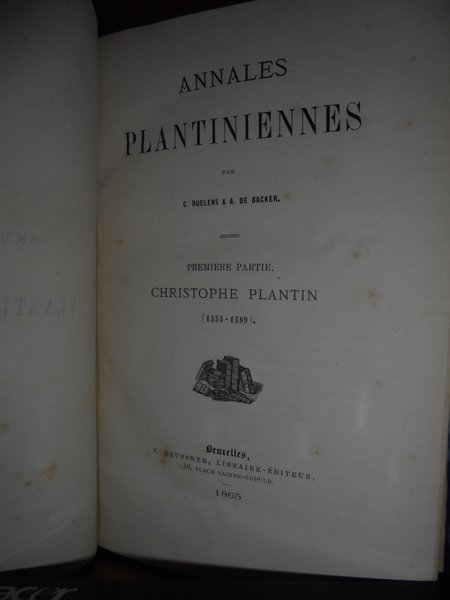 par C. Ruelens & A. De Backer. Bruxelles, F. Heussner Libraire, 1865. ANNALES PLANTINIENNES. Première Partie Christophe Plantin (1555 - 1589). In-8° piccolo, m. pelle con larghe punte, fregi e titolo in oro al dorso. 339 pp. Ottimo esemplare della rara edizione originale, Uff. E - II - 4