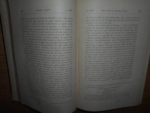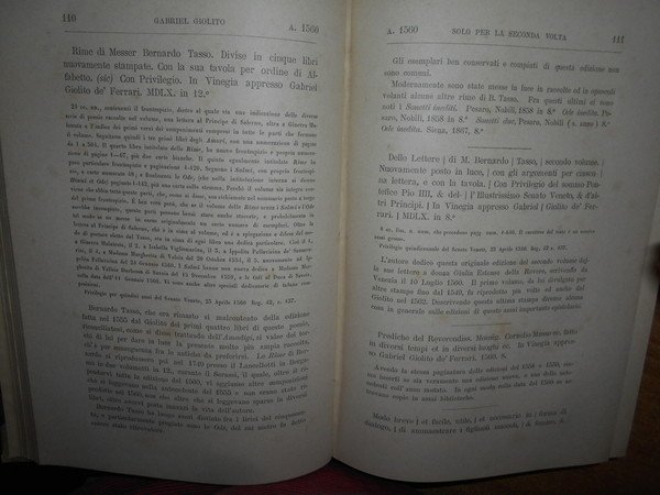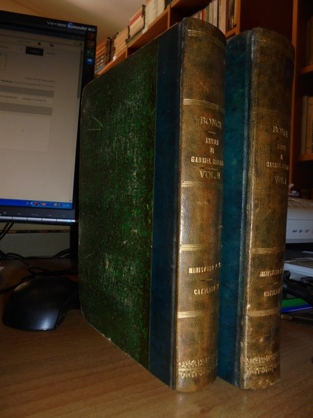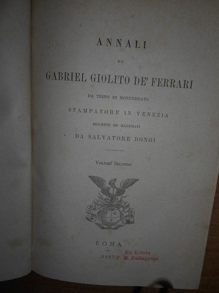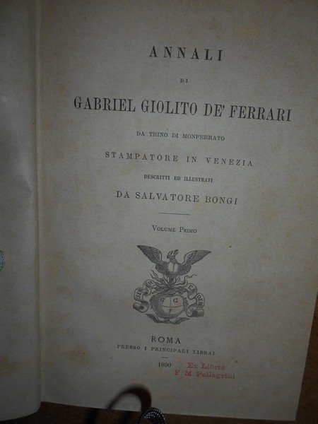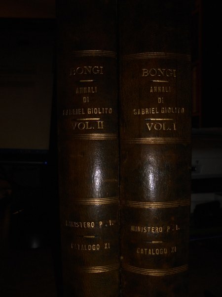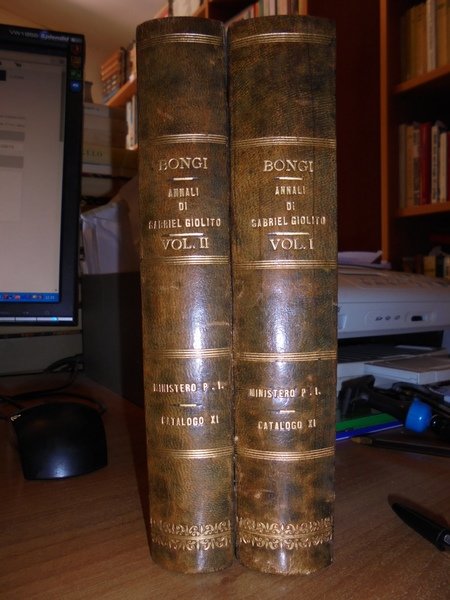Bongi, Salvatore. Roma, presso i Principali Librai, 1890 - 1895. ANNALI di Gabriel Giolito De' Ferrari da Trino di Monferrato. Edizione originale. 2 volumi in-8°, m.pelle coeva con fregi e titoli in oro ai dorsi. cxiii, 511 pp. 1 f. errata.; 541 pp. Ottimo esemplare in prima edizione con timbretti ex Libris nei frontespizi e uno nel margine interno del vol 2°. Neg. mob. 8