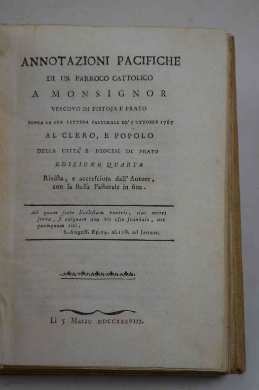 Annotazioni pacifiche di un parroco cattolico a monsignor vescovo di Pistoja e Prato sopra la sua lettera pastorale de' 5 ottobre 1787 al clero, e popolo della città e diocesi di Prato. Edizione quarta...