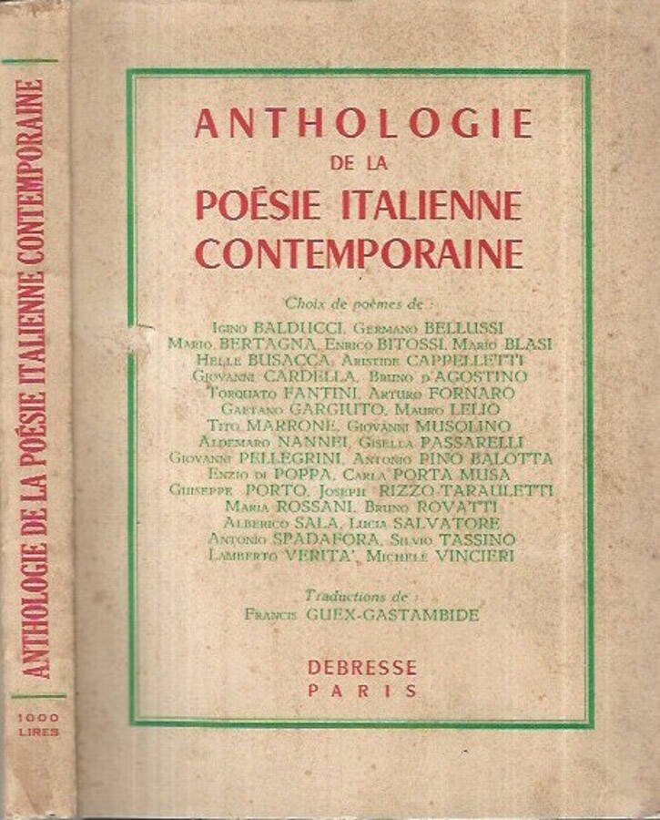 Antologia della poesia italiana in lingua francese. Edizione in brossura con la traduzione di Guex-Gastambide. Il volume è in discreta conservazione, la legatura è forte, le pagine interne sono brunite dal tempo, con il taglio ancora intatto. Numero pagine 229.