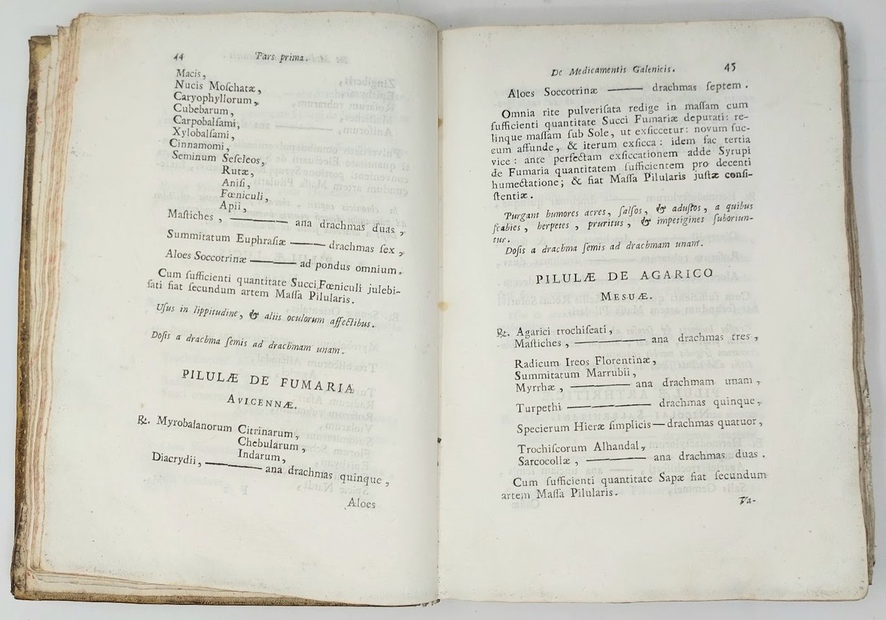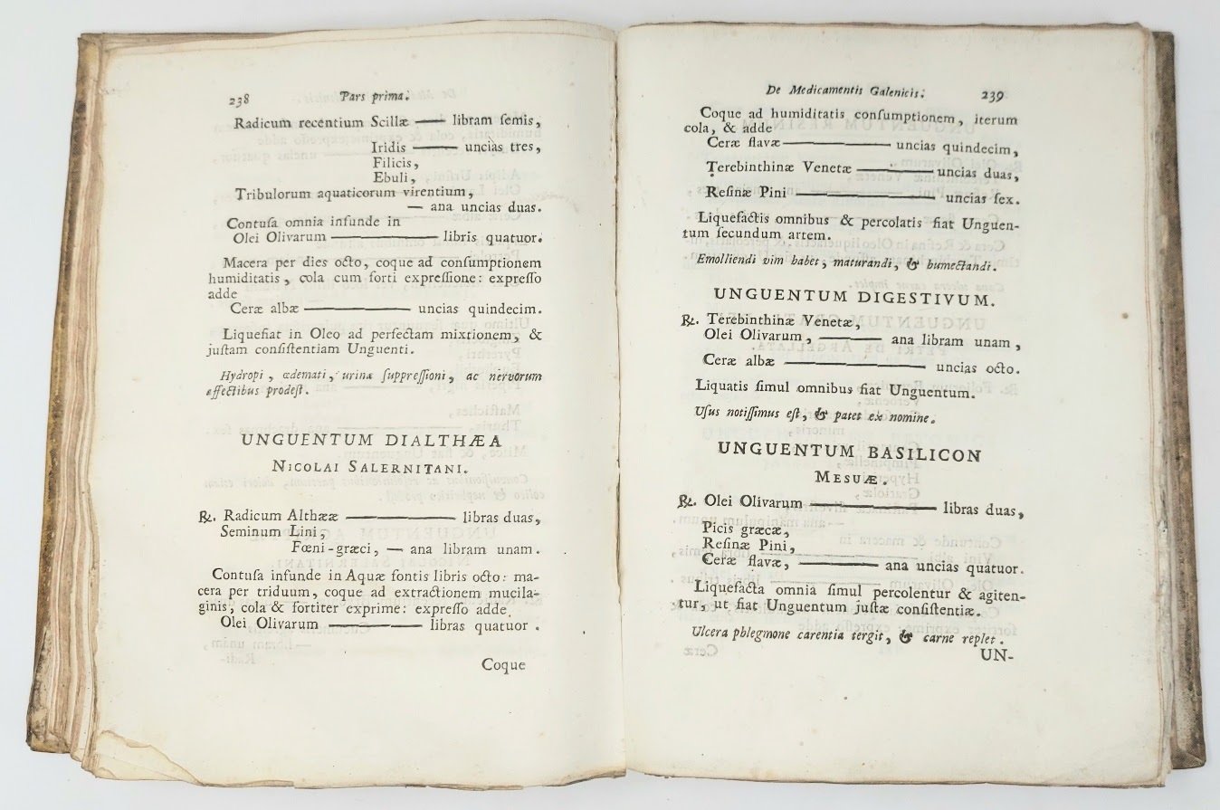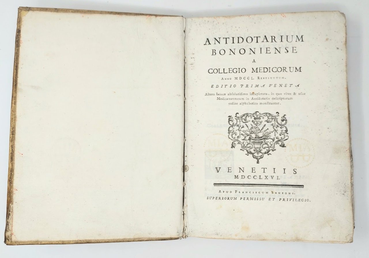 >in-4, pp. VI, (2), 570, (2), legatura coeva in pergamena rigida. Dedica a Papa Benedetto XIV. Prima edizione veneziana del noto e vasto ricettario bolognese delle medicine e contravveleni, già apparso all'inizio del XVII secolo. Fu un ricettario medico fondamentale per oltre un secolo. Corredato di vasti indici degli autori e delle materie, il secondo indice elenca in ordine alfabetico le qualità e i principi d'uso dei medicinali descritti nell'opera. Esemplare discreto, assai marginoso e ben impresso, ma che fu evidentemente consultato ed usato profusamente (diverse macchie, piccoli strappi e fogli allentati anticamente rinforzati). Frati, Bibliogr. Bolognese, vol.I, 6051.