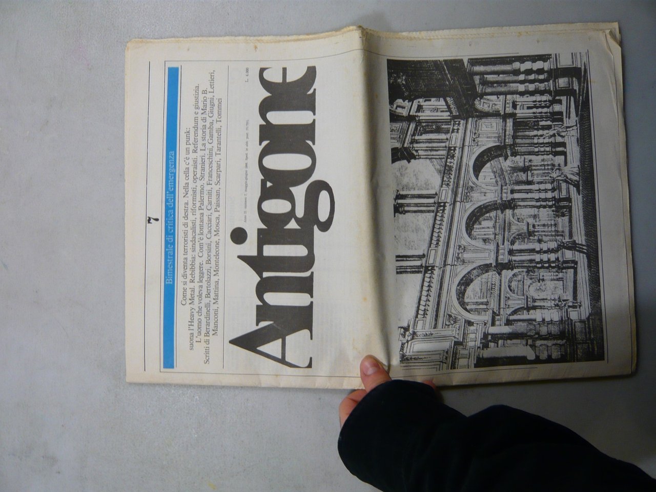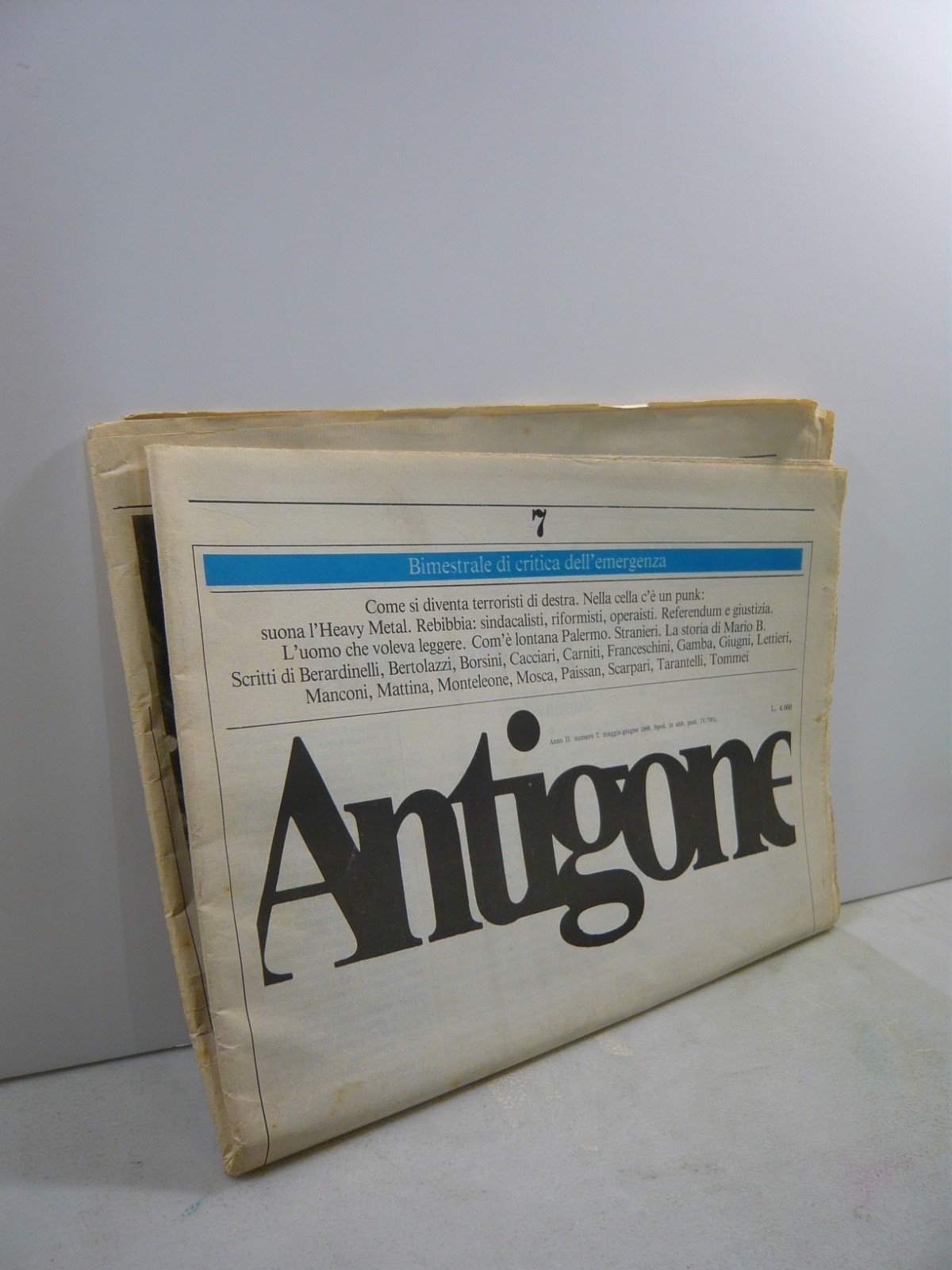 ANTIGONE N°7Bimestrale di critica dell’emergenzamaggio-giugno 1986, RomaRivista, 43x30 cm, pp. 40Con illustrazioni in copertina e nelle pagine a foto in bianco e neroScitti di Berardinelli, Cacciari, Franceschini, Giugni, Lettieri e altriPeso: g. 146Cod: 4853CONDIZIONI DELLA RIVISTA:Segno della piega centrale, angoli di pagine piegate. Strappo visibile a prima pagina, senza mancanze. Pagine leggermente ingiallite.