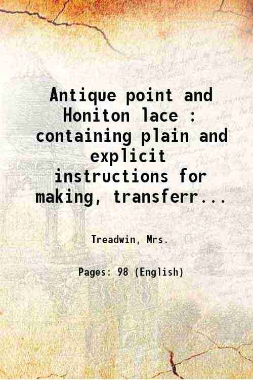 Antique point and Honiton lace : containing plain and explicit instructions for making, transferring, and cleaning laces of every description : with about one hundred illustrations, outlines and prickings of the principal antique point stiches and Honiton sprigs / by Mrs. Treadwin. 1800