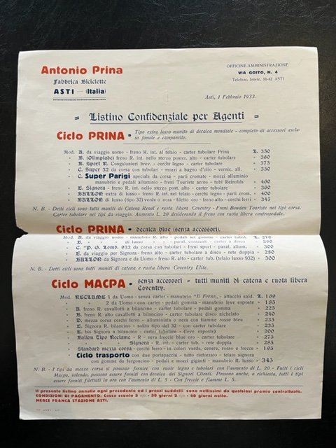 Foglio cm 23 x 29, con piega centrale e lieve mancanza al margine, listino del febbraio 1933 di questa fabbrica astigiana di biciclette, la Antonio Prina. Con elenco dei diversi modelli e relativi prezzi.