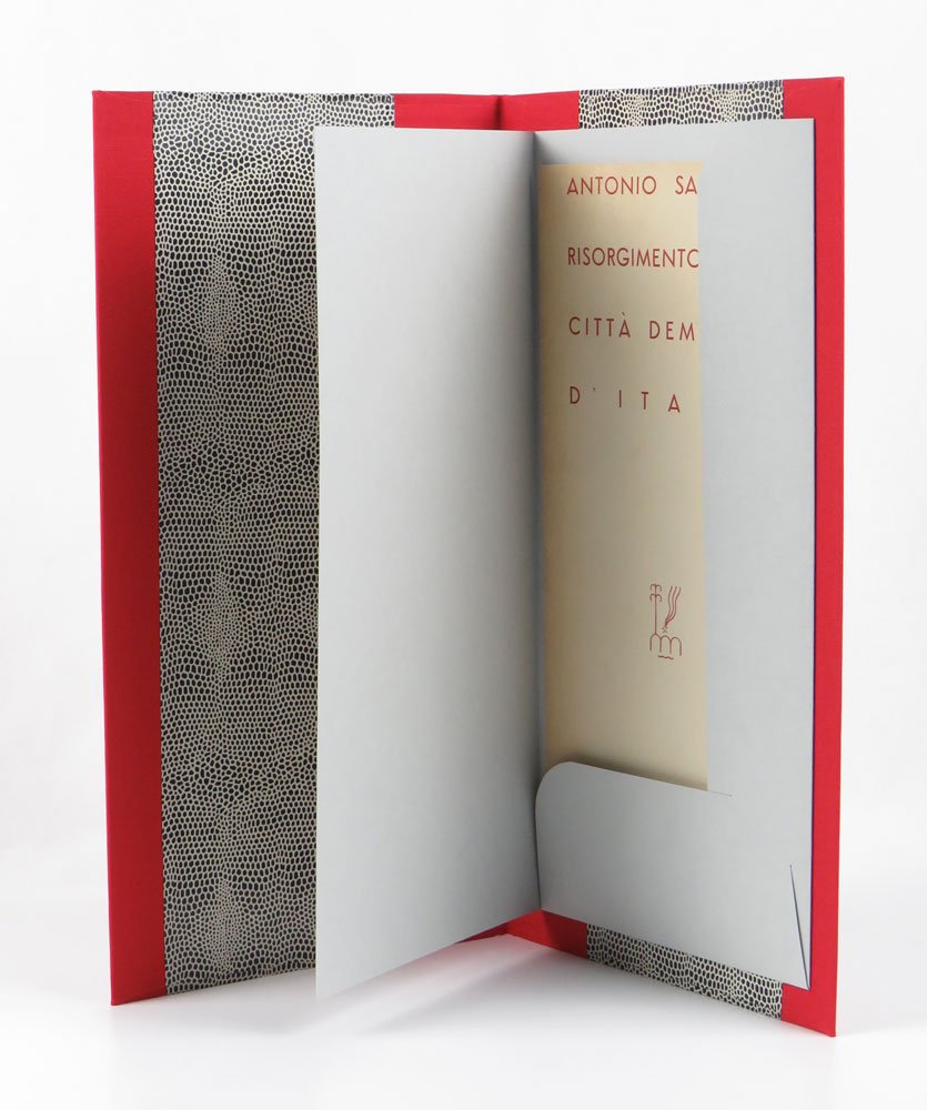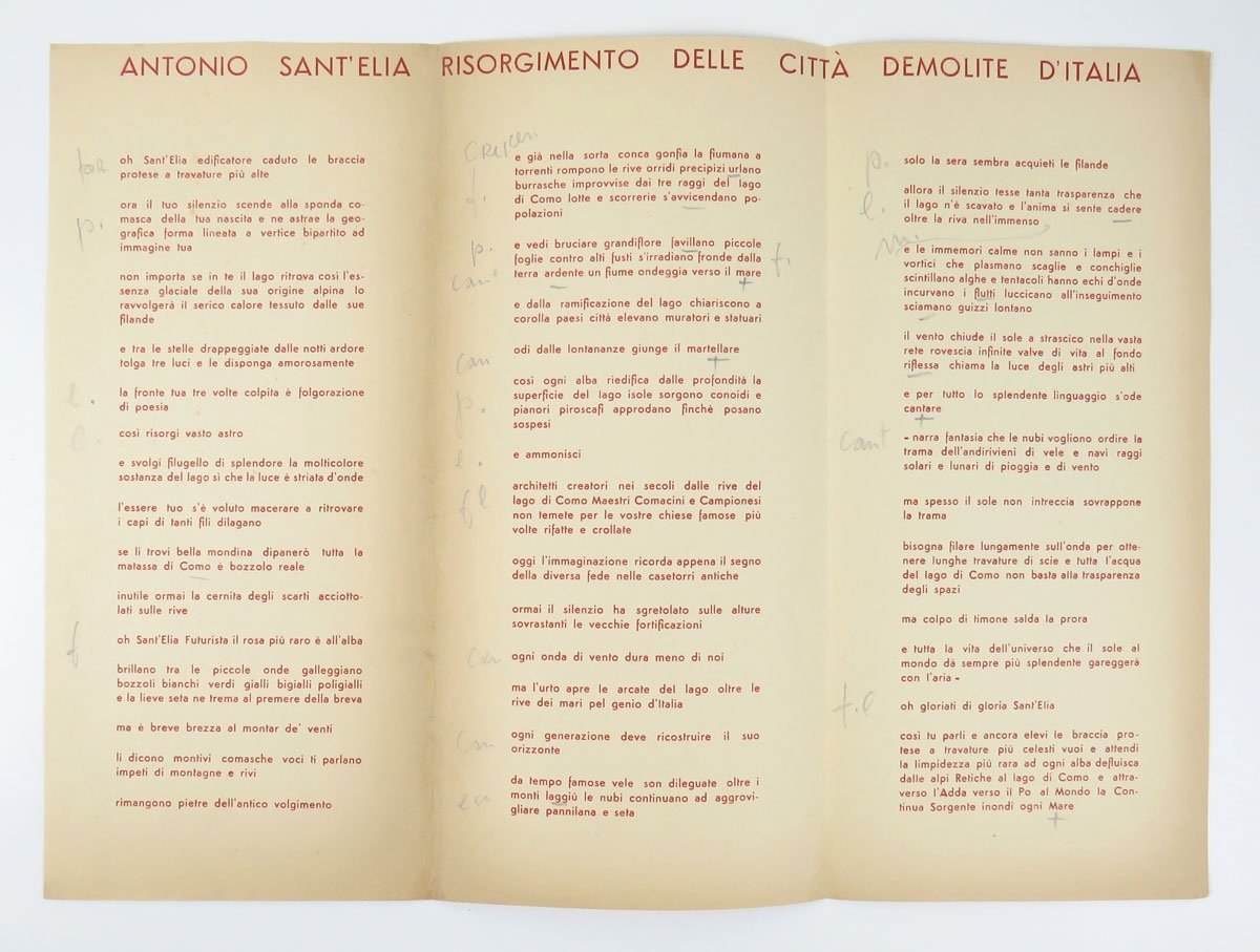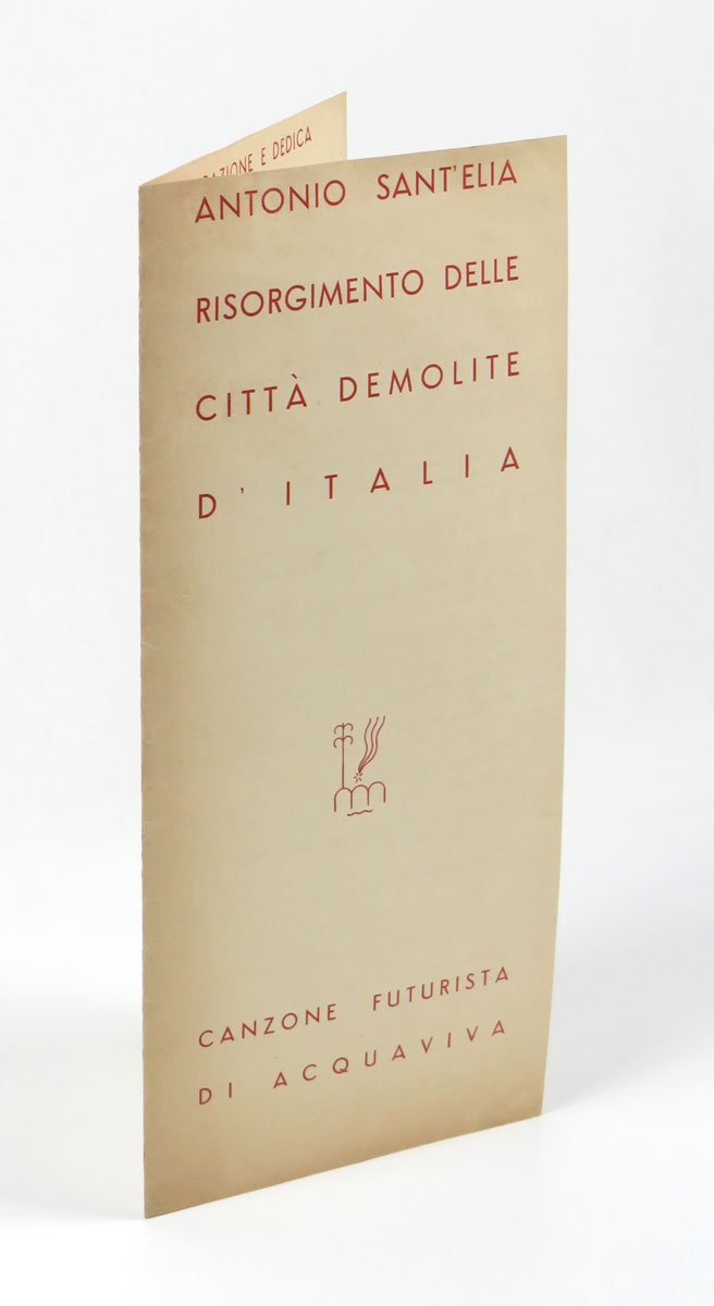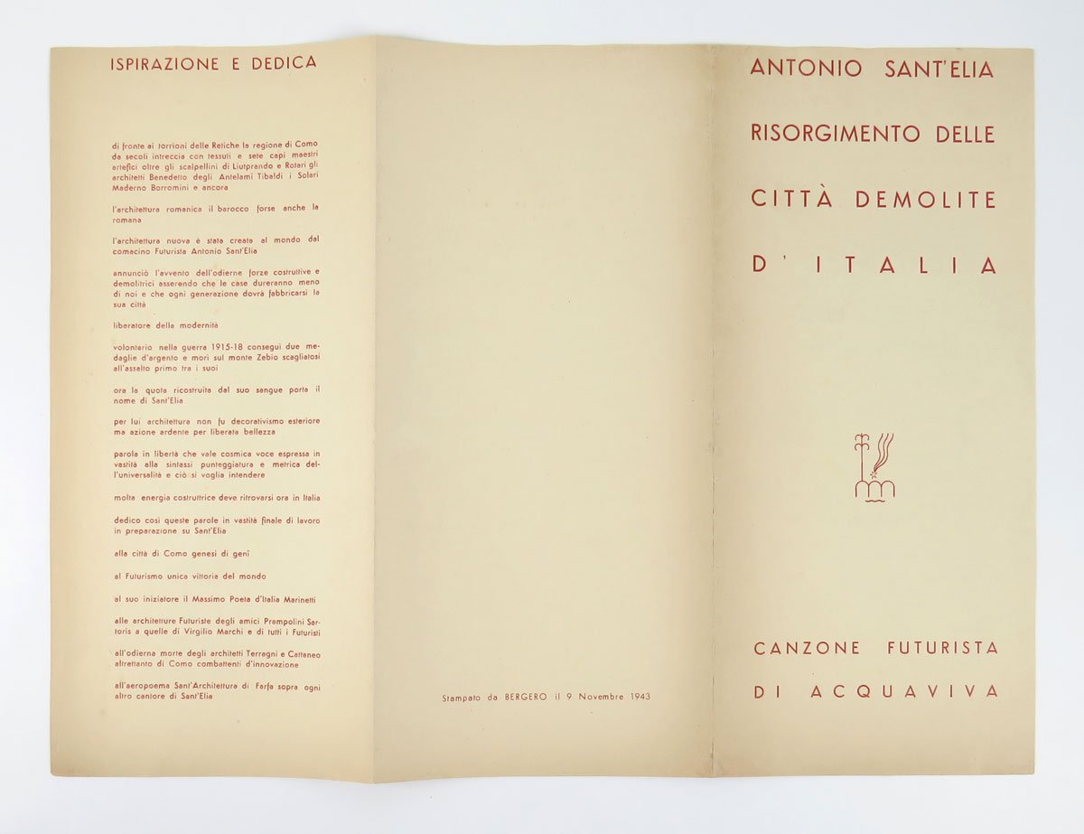 EPHEMERAEdizione originale. CON AUTOGRAFO.Esemplare pregiato dalla dedica autografa dell’autore vergata in grande sull’ultima anta «ad Enrica Valenziano | Acquaviva | Savona Gennaio 45»; in ottime condizioni (da segnalare per scrupolo leggere tracce di una pregressa piegatura incongrua; una leggera gora alla prima anta, che non tocca il testo; leggerissime fioriture sull’ultima anta; segni d’attenzione al testo in leggera grafite, rimovibili).Rarissima pubblicazione autoprodotta nel formato efmero del dépliant / manifesto: manca del tutto ai repertori istituzionali online ICCU e OCLC. Brillante esempio della vivace attività messa in campo dal gruppo futurista savonese animato da Acquaviva e Farfa, ultimissimo baluardo di autentica avanguardia futurista nel disperati anni della guerra. L’impaginazione è svolta secondo un rigoroso gusto razionalista, facendo svolgere il testo incolonnato nelle ante interne (nn. [2]-[4]), mentre il titolo corrente si estende in maiuscolo lungo tutta l’estensione del foglio. L’ultima anta di testo (n. [5]), intestata «Ispirazione e dedica», chiude sottolineando lo stretto legame instauratosi tra futurismo e razionalismo nel corso degli anni trenta: «all’odierna morte degli architetti Terragni e Cattaneo | altrettanto di Como combattenti d’innovazione | all’aeropoema Sant’Architettura di Farfa sopra ogni | altro cantore di Sant’Elia». Terragni e Cattaneo erano scomparsi giovanissimi, uno dopo l’altro nell’estate del 1943.Cammarota, Futurismo, 1.2; Echaurren, Futurcollezionismo, pp. 45-48; Ferro, La Canzone futurista a Sant’Elia di Acquaviva (in: Resine 119-121, 2009: 90-95)