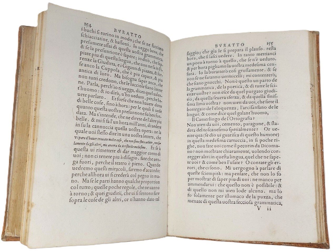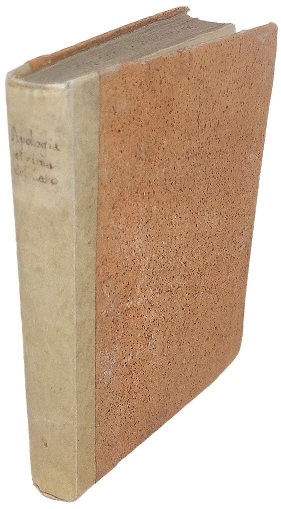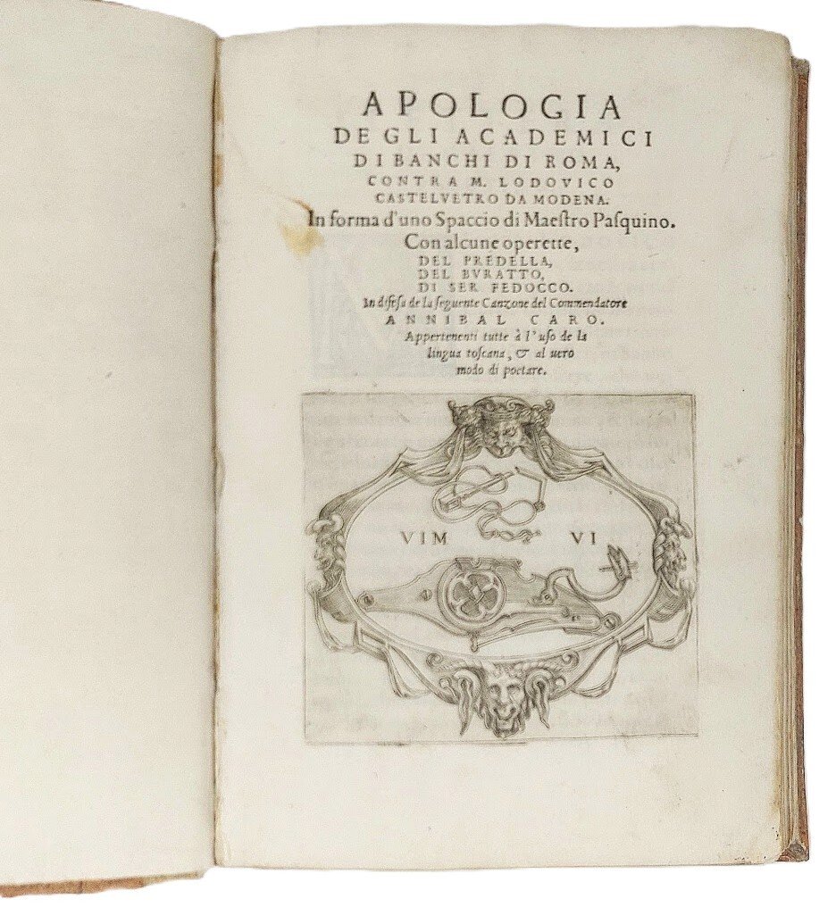 >in-4 (205x150), pp. 268, (16), elegante legatura ottocentesca in mezza pergamena, titolo manoscritto al dorso ed ai tagli. Al frontespizio la curiosa impresa raffigurante un acciarino da fucile ed una corda sopra di esso, con il motto ''Vim vi'', impressa in rame: ''Avvertasi ancora che qualche esemplare col titolo di Apologia ec, ha nel frontispizio una diversa impresa, ora intagliata in legno, ed ora in rame, portante un acciarino da fucile...'' (Gamba 276). Impresa dell'Unicorno in fine. Prima edizione. Ben nota è la polemica, ''più che letteraria guerra'', che originò questo aspro libello. Alle critiche mosse dal Castelvetro alla sua canzone ''Venite a l'ombra dei gran gigli d'oro'', scritta in lode della Casa di Valois per incarico del card. Farnese nel 1553, il Caro rispose con la ''Apologia'' che ridicolizza e sbeffeggia l'avversario, accusato anche di assassinio e di eresia, tramite una serie di sonetti satirici e violentissimi, i famigerati ''Mattaccini'' (pp. 226-232), seguiti dalla ''Corona'' (pp. 237-241). Buon esemplare, qualche sporadica marginale macchietta. Adams C-739. Gamba 276. Razzolini p. 88. Cfr. Tiraboschi, Biblioteca Modenese (I, 440 e segg.) e Storia della Letterat. ital. (VII, 1695 e segg.).
