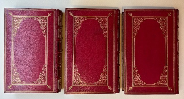 Tre volumi in-16° (154 x 90 mm.), pp. (6), XXXVI, XLVIII, 200, (48); (6), 201-624; (8), 434, tre antiporte incise in rame allegoriche, frontespizi in rosso e nero con marca calcografica. Stupende legature in pieno marocchino rosso, dorsi a cinque nervi, con titolo e fregi in oro, ai piatti duplice cornice lineare , al loro interno sinuosi fregi geometrici neoclassici agli angoli, raccordati da linee puntinate, dentelle interna, tagli dorasti. Splendido esemplare assai fresco. La migliore edizione di questa opera classica dello stampatore e umanista Henri Estienne (1528-1598). Pubblicata a Ginevra nel 1566, censurata su richiesta di Calvino, l'Apologia di Erodoto resta 'l'opera in volgare più popolare di Henri Estienne, uno dei monumenti della prosa francese del XVI secolo e un capolavoro del genere satirico' (Fred Schreiber).