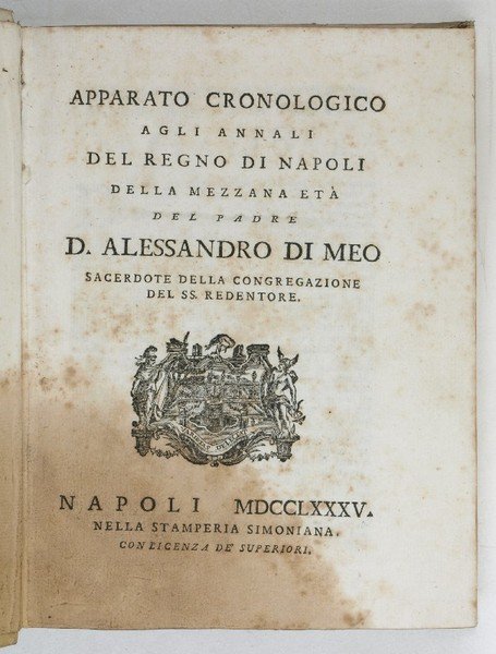 4to. XVI, 428 pp. Contemporary vellum with giltstamped title to spine. First edition of this manual of the early medieval history of Naples, then the "Ducatus Neapolitanus". Contains an introductory chapter on the various systems of dating history, including a section "dell' Egira di Maometto." - Somewhat brownstained throughout. From the library of the Ducs de Luynes at the Château de Dampierre: their bookplate reproducing the arms of Charles Marie d'Albert de Luynes (1783-1839), 7th Duc de Luynes, on pastedown. - Graesse IV, 492 (note). OCLC 13014050. Cf. Olschki (Choix) 20771 (1851 Spoleto reprint).