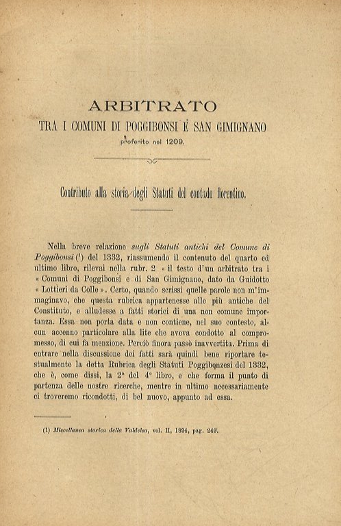 Arbitrato tra i comuni di Poggibonsi e San Gimignano proferito nel 1209. Contributo alla storia degli Statuti del contado fiorentino.