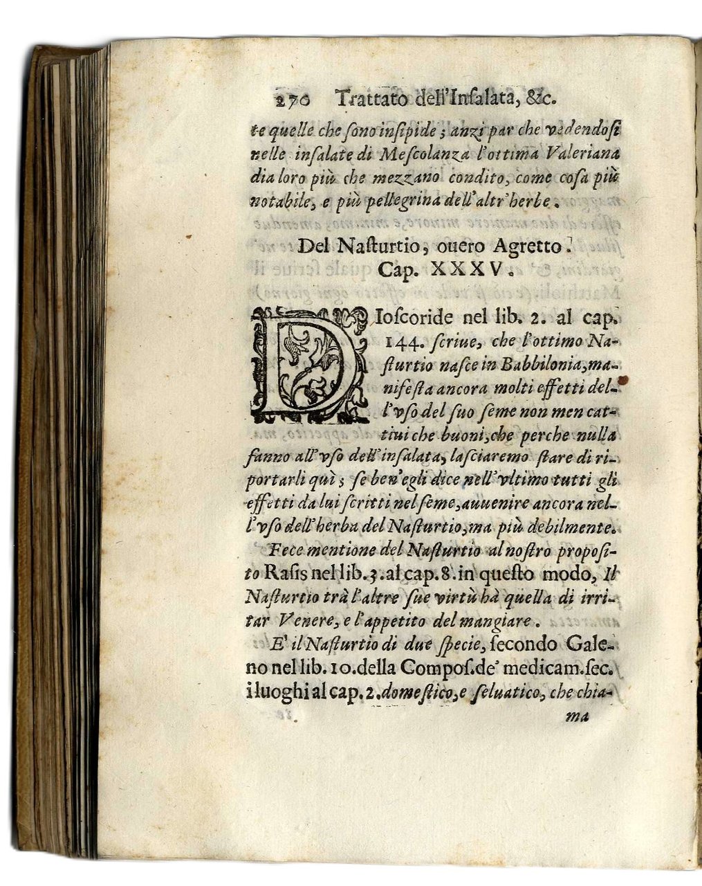 >in-4 (205x150), pp. (8), 426 (ma 436), (4, di cui ultimo foglio bianco), stemma dei Colantoni cui l'opera è dedicata, inciso in rame nel frontespizio, capilettera figurati, bella legatura coeva in pergamena floscia, titolo calligrafato in gotico lungo il dorso. Prima edizione del primo trattato dedicato interamente all'insalata. Nei 68 capitoli l'autore analizza l'argomento con una gamma impressionante di notizie sia storico-scientifiche sia pratiche, che rendono l'opera gustosa ed ancora attuale. Massonio suggerisce ricette classiche e di sua invenzione fornendo utili consigli sul miglior modo di servirle. Nell'utilizzo dei vari ingredienti e condimenti sono inclusi tra gli altri, olio d'oliva, aceto, sale, pepe, limone, aglio, cipolla, basilico, capperi, tartufo, finocchio, rucola, lattuga, valeriana, asparagi, fave, piselli, fagioli, frutta, fiori di rosmarino. Nella descrizione degli ingredienti l'autore riferisce scrupolosamente le fonti delle sue scoperte, includendo tra gli innumerevoli autori citati Plinio, Plutarco, Cicerone, Aristotele, Avicenna, Mercuriale, Ippocrate. Salvatore Massonio nasce a l'Aquila nel 1554, medico e letterato, morì a Napoli nel 1624, senza riuscire a vedere l'ultima delle sue opere pubblicata, fu autore di un'opera sulla sua città natale, 2 di carattere religioso e di un'importante monografia dedicata all'uso dei bagni nell'antichità. Il Lastri nella sua Biblioteca Georgica-Firenze, 1787-descrive Massonio come "indagatore di cose nuove, indicò gli usi di alcune erbe meno note, definì il loro sapore e rammentò alcune particolarità di esse". Interessante e rara opera interamente dedicata a questo insolito soggetto. Piccolo lavoro di tarlo al margine bianco tra pp. 79-112. Maggs 120; Cagle 1160; Henssler 1362.; Simon, Bibliotheca gastronomica 1023;Westbury 146; Marciana 1003;Krivatsy 7547; Wellcome I, 4118; B.IN.G. 1266; Bitting p. 315; Vicaire 577. STC 17th Century, 556; S. Massonio, Archidipno, ovvero dell'insalata e dell'uso di essa, eds. M. Paleari Henssler & C.S. Ferrero, Milano 1990.