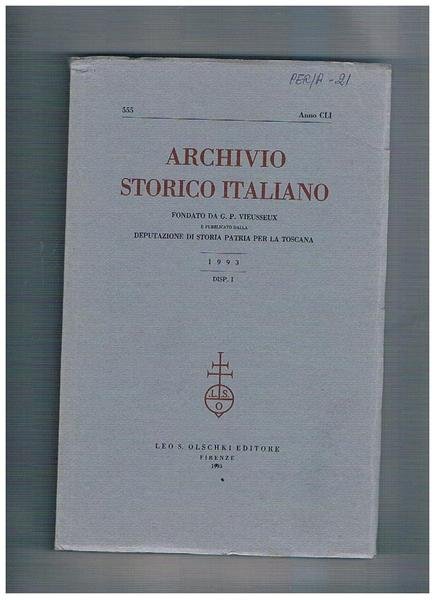 Archivio storico italiano, trimestrale fondato da G. P. Viesseux. Anno 1993 disp. n° 1. Contiene: la "provvisione" del 1550 sulle "hore dè magistrati" e la politica di buon governo del duca Costantini Ià dè Medici; per una storia della stamperia Stecchi e Pagani (Firenze 1766-1798); ecc.