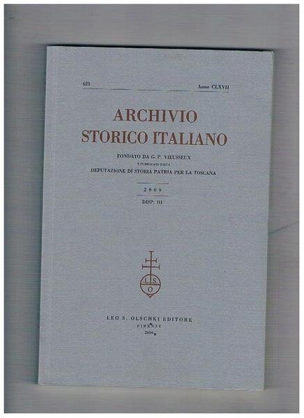 Archivio storico italiano, trimestrale fondato da G. P. Viesseux. Anno 2009 disp. n° 3. Contiene: prestatori toscani a Cividale nel XIV secolo: mercato del denaro e pratiche creditizie; la "chave de Lombardia" un'area al confine tra Milano, Genova e Firenze; ecc.