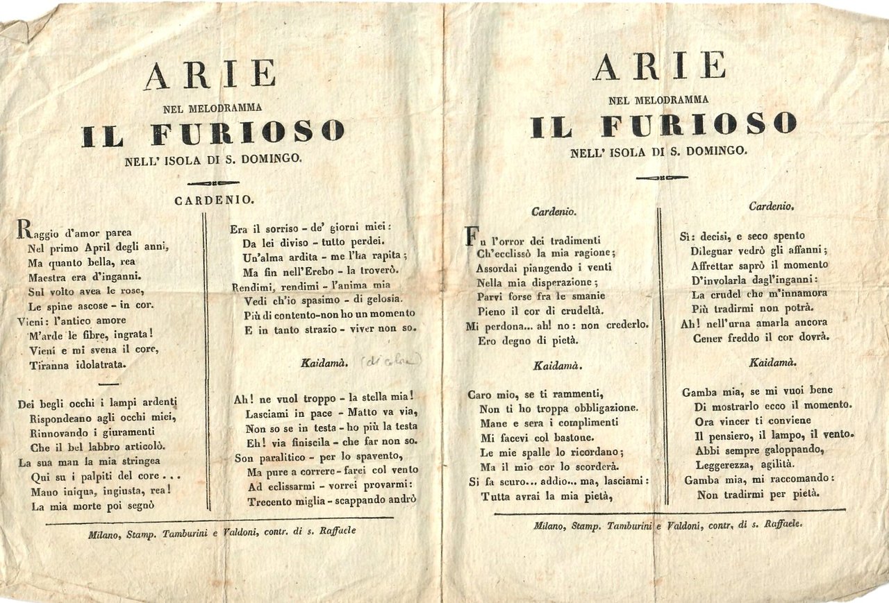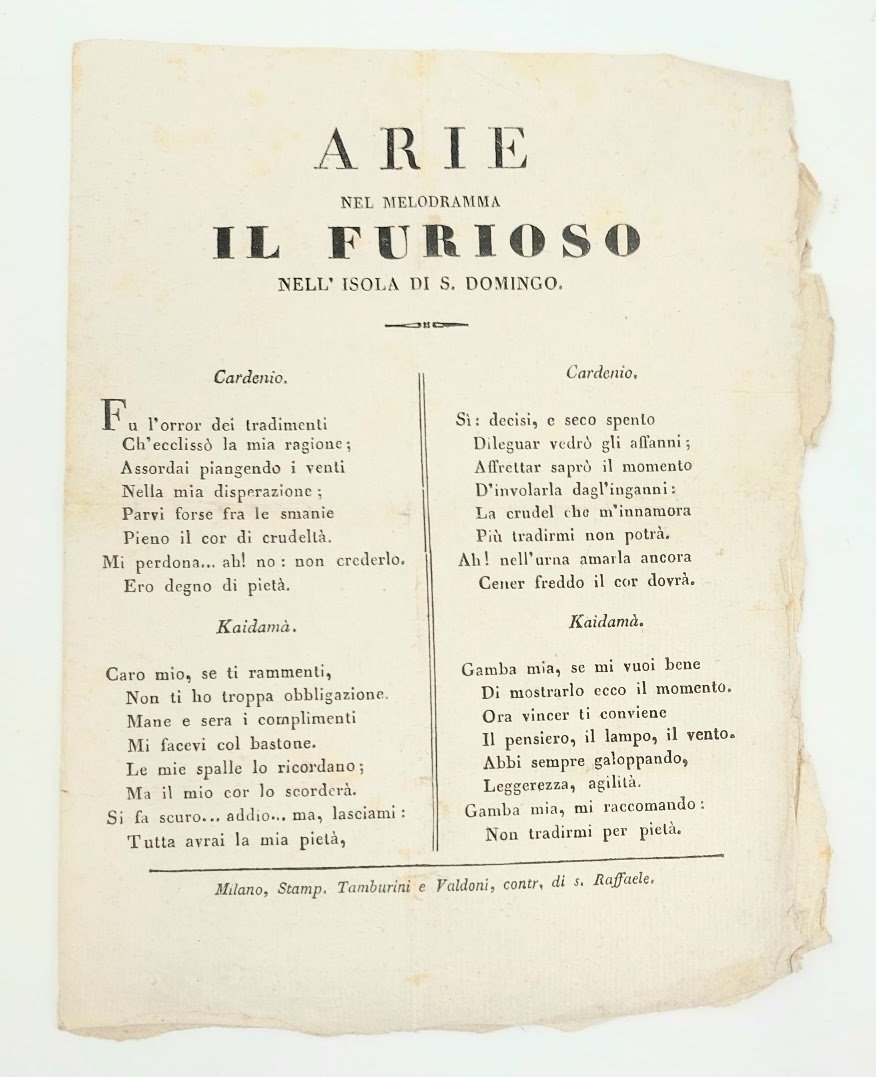 >Bifolio (mm 195x143 per ognuna delle pagine, impresse solo al recto). Introvabile foglio volante, estratto dall'opera semiseria musicata da Donizetti su libretto di J.Ferretti. Rappresentata a Roma nel 1833, e per anni assai popolare, fu tra le prime opere a trattare la follia maschile, seppur in chiave tragicomica: il ruolo del buffo è incarnato dal servo nero Kaidamà, su cui il protagonista sfoga le proprie delusioni amorose a colpi di bastone. Comprende 8 ottave interpretate dai due protagonisti. Di notevole interesse sono le relazioni con il Don Quijote, oltre alla "location" in cui si svolge: l'isola di Santo Domingo. La colonia fu fondata da Bartolomeo Colombo ed è la più antica del Nuovo Mondo che sia tutt'ora esistente. A pieni margini (barbe con strappetti), ottimamente conservato.