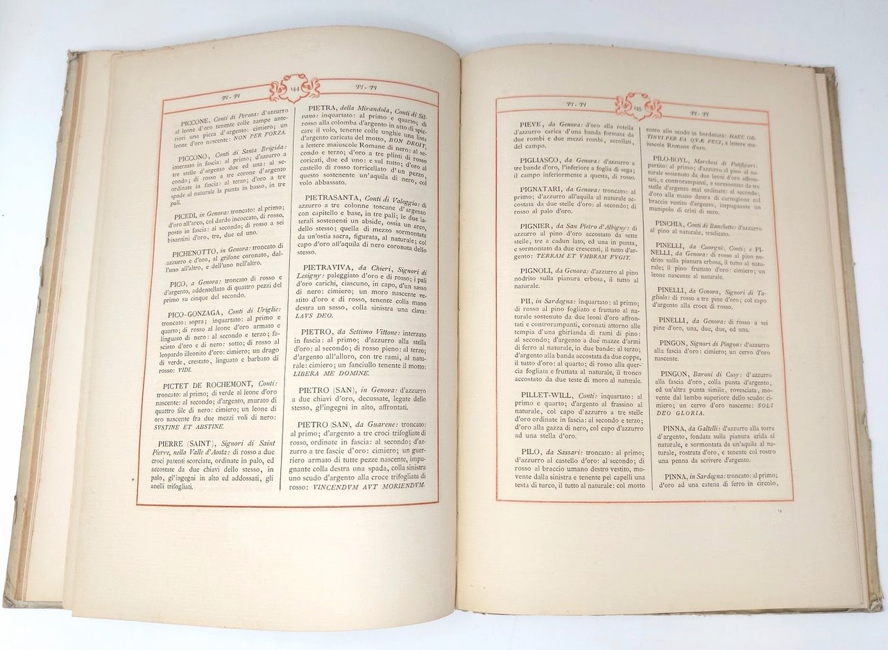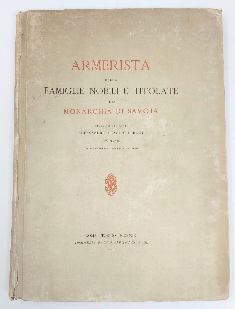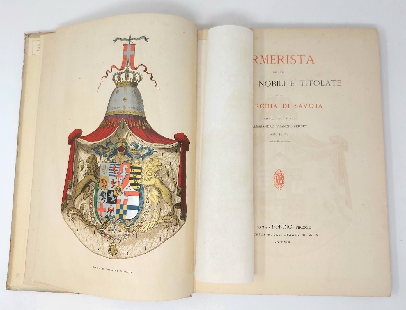 >in-4, pp. XVI- 242, (2), legatura editoriale in cart. con titoli in rosso e nero (segni di usura ad angoli e cerniere). In antiporta, grande stemma di Casa Savoia a colori, uno stemma sabaudo n.t. (a pag. XVI) e 2 tavole f.t. contenenti 50 stemmi in cromolitografia. La più dettagliata opera sulla genealogia di centinaia di famiglie nobili piemontesi, assai ricercata e non comune. Le pagine da 203 a fine contengono un dettagliato ''indice alfabetico-tecnico dell'armerista ...ossia delle principali pezze e figure che s'incontrano negli stemmi''.Figurato con 3 tavole di vari stemmi in cromolitografia, tra i quali quello di Casa Savoia a colori e in oro a piena pagina. La più dettagliata opera sulla genealogia di centinaia di famiglie nobili piemontesi, assai ricercata e non comune. Le pagine 203 a fine contengono un dettagliato ''indice alfabetico-tecnico dell'armerista ...ossia delle principali pezze e figure che s'incontrano negli stemmi''. Bell' esemplare. Spreti, 1573. Colaneri, 721. Manno, I, 2575. Saffroy, II, 33754: «Les 3 planches donnent 51 blasons. Cet ouvrage rare déborde largement le cadre de la Savoie et concerne également le Bugey, le Pays de Vaud, le canton de Genève, la vallée d' Aoste et le comté de Nice».