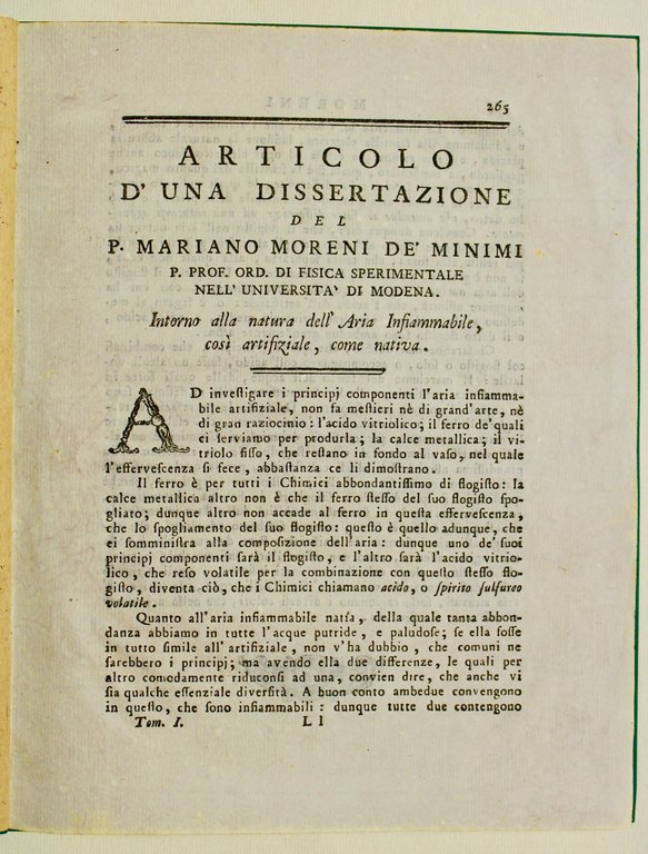 Articolo d'una dissertazione intorno alla natura dell'aria infiammabile, così artificiale, come nativa.