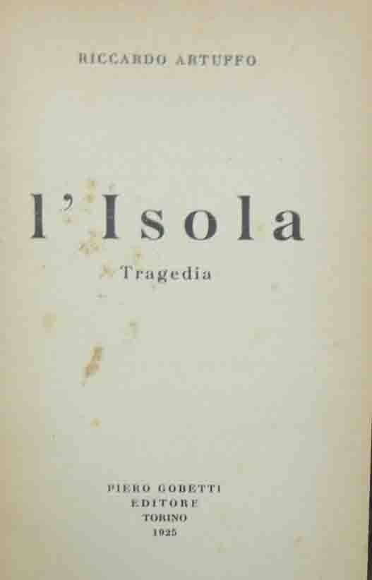Riccardo Artuffo, L’isola. Tragedia, Piero Gobetti Editore, Torino 1925, pp. 249, cm 19, legatura in mezza tela nera con titoli manoscritti al dorso. Minime fioriture, carta lievemente brunita, per il resto ben conservato.