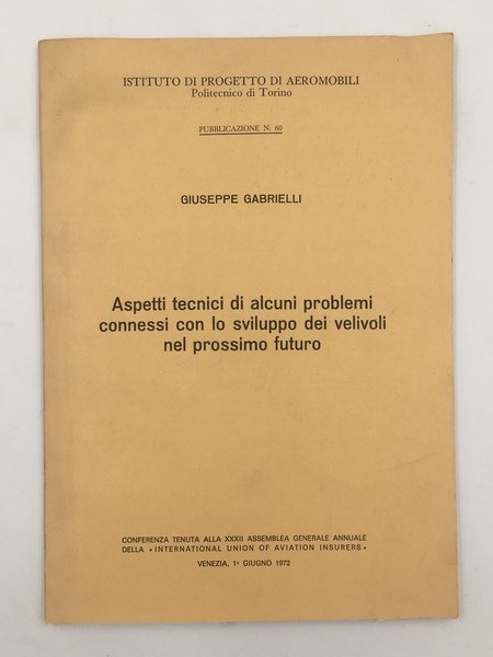ASPETTI TECNICI di alcuni PROBLEMI connessi con lo SVILUPPO dei VELIVOLI nel prossimo FUTURO. Conferenza tenuta alla XXII Assewemblea Generale annuale della "International Union of AVIATION Insurers". Venezia, 1° giugno 1972. | Rare and modern books | Gabrielli Giuseppe, Istituto Di Progetto Di Aeromobili