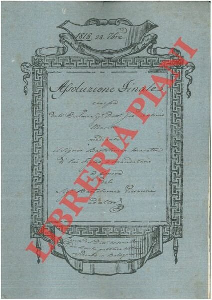 Bologna, 1818, febbraio 28, rogito originale di 6 pp. in cartella con bella cornice xilografica, timbro a secco, firma del notaio Antonio Emilio Bacchi di Bologna