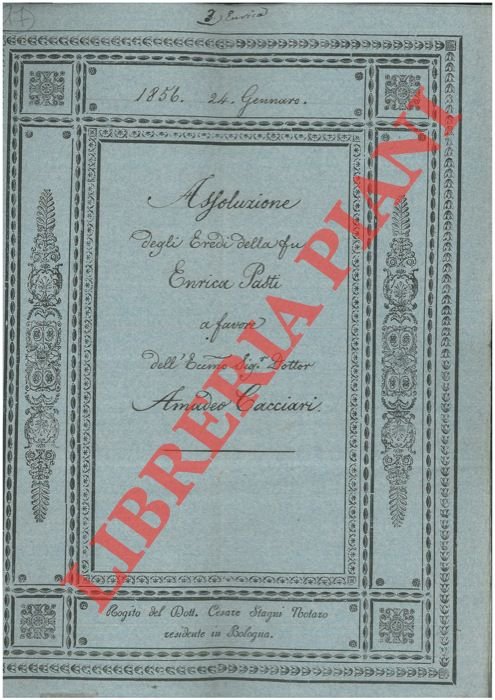 Bologna, 1856, gennaio 24, rogito originale di 8 pp. in cartella con bella cornice xilografica, timbro a secco, firma del notaio Cesare Stagni di Bologna