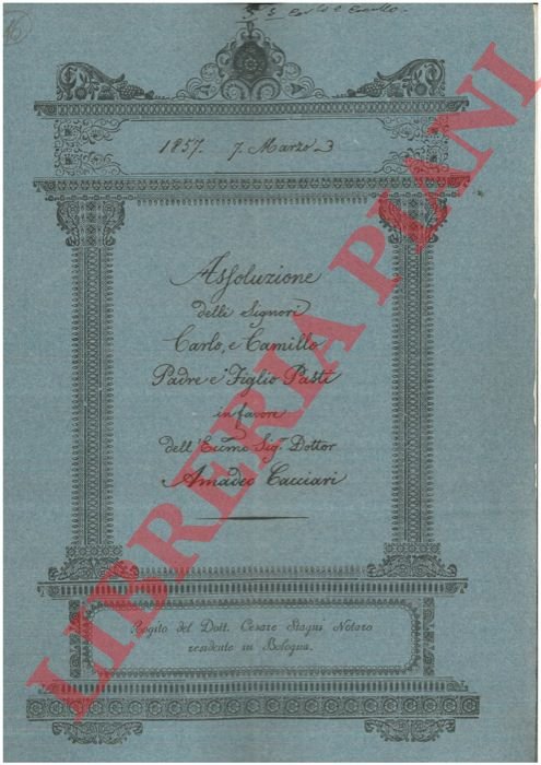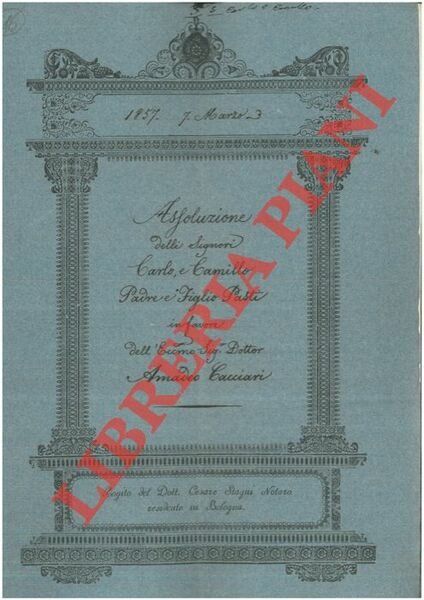 Bologna, 1857, marzo 7, rogito originale di 4 pp. in cartella con bella cornice xilografica, timbro a secco, firma del notaio Cesare Stagni di Bologna
